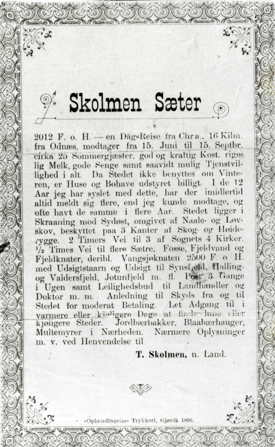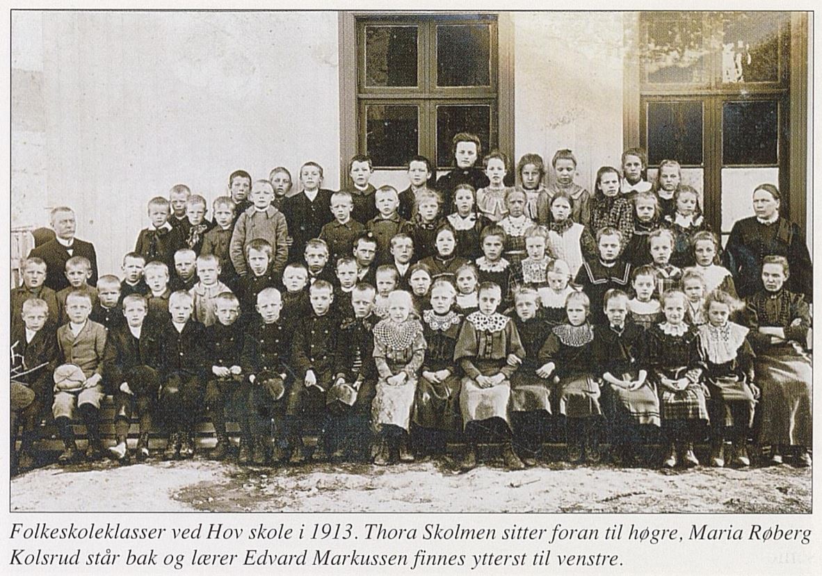Thora Skolmen was born on 21 July 1868 at the Skolmen farm in Nordre Land. She was the sixth of the ten children of Torger Hansen Skolmen and Ingeborg Kristiansdatter Væle.