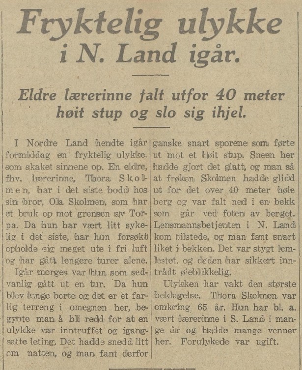 On 10 October 1933, Thora suffered a fatal accident. According to a newspaper article from Oppland Arbeiderblad on 11 October 1933, Thora was living with her brother, Ole Skolmen, at the time on the Southern Skolmen farm. As she had been a bit sick, she had tried to stay outdoors a lot and had gone on longer walks alone. The morning of the 10th October she had, as usual, gone for a walk. However, she was gone for much longer than usual.