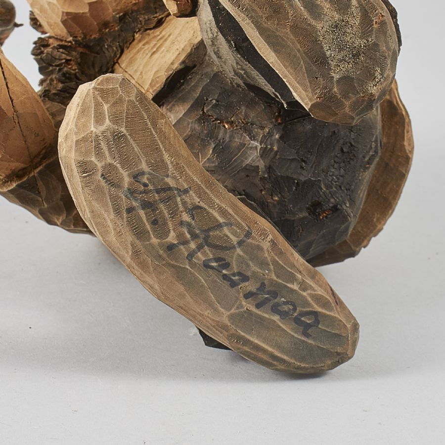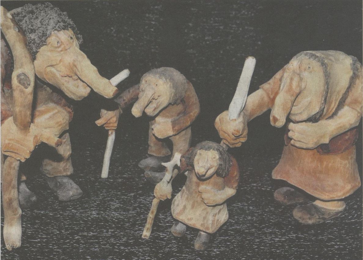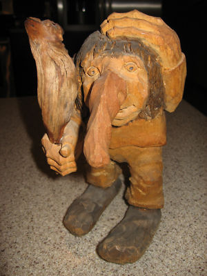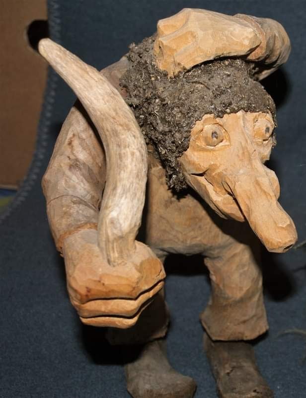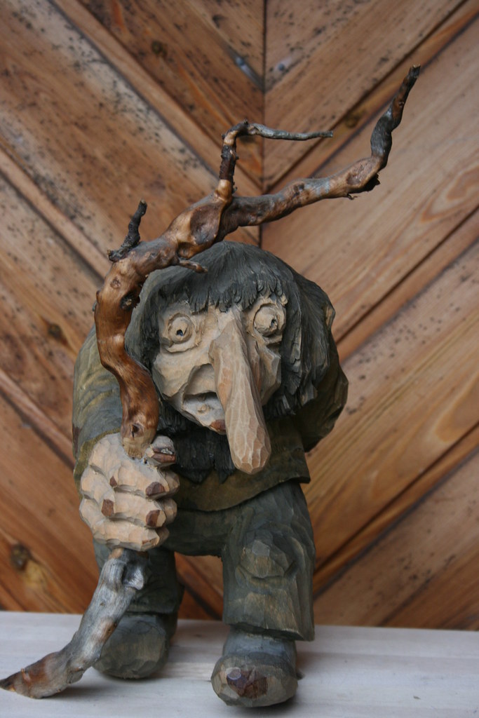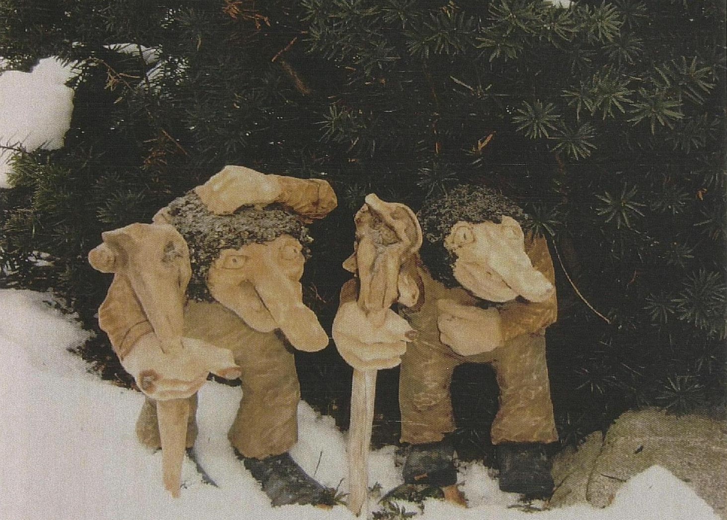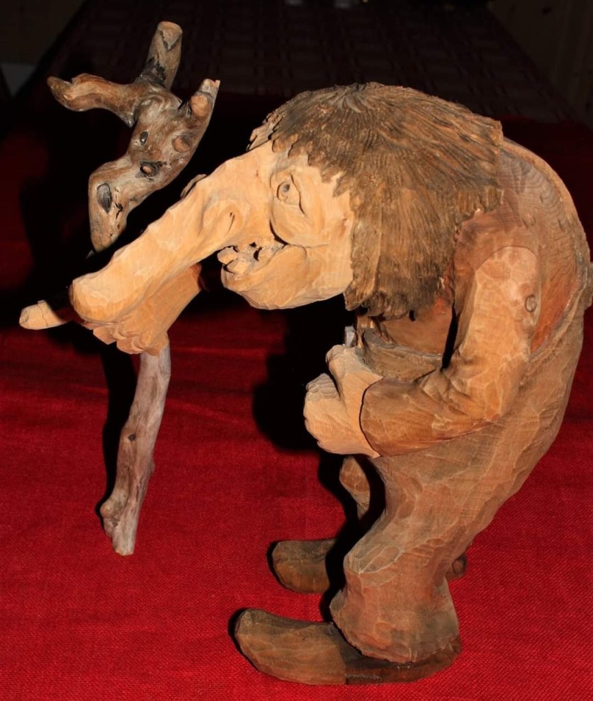 His trolls are often holding large walking sticks of natural odd shapes most likely picked directly from the ground. He used earthly colours as you would find them out in nature; at night you would not be sure if you encountered a troll or a dry pine. For some trolls he glued chipped pieces of wood to the top of the troll’s head and painted them black to create textured hair.
