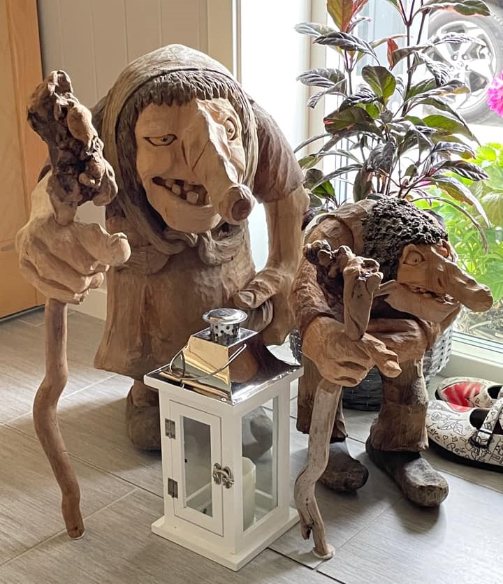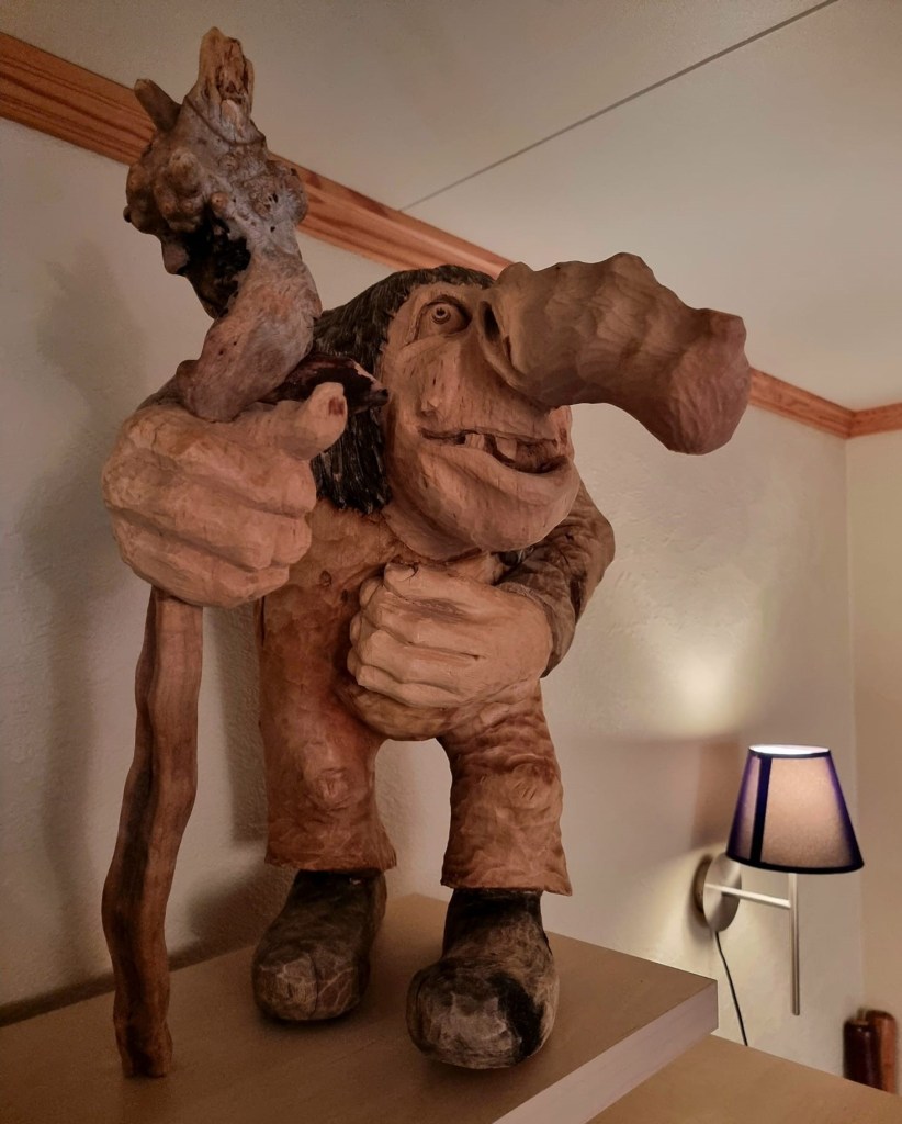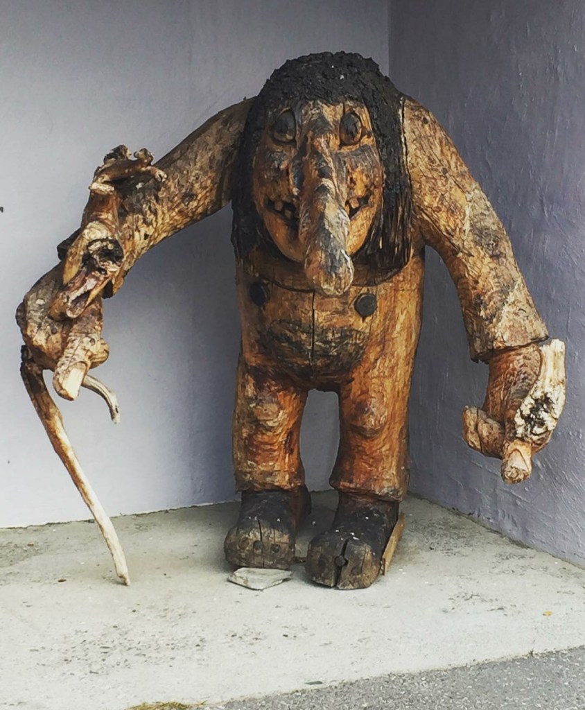 Below is Asbjørn’s large Dovregubben carved troll in Dombås, Norway. The troll has his signature design features – The long nose, long feet, body shape, eyes, etc.