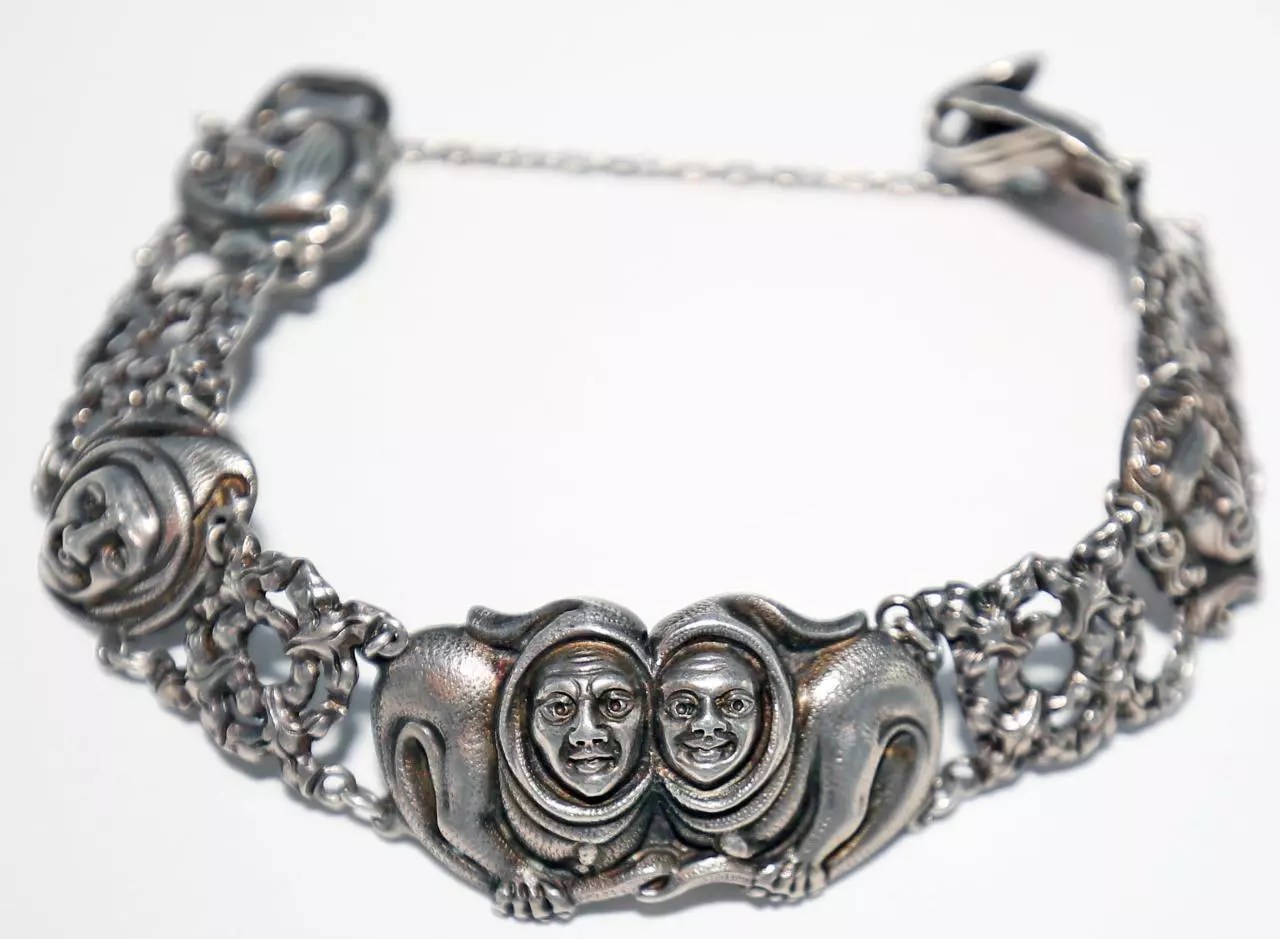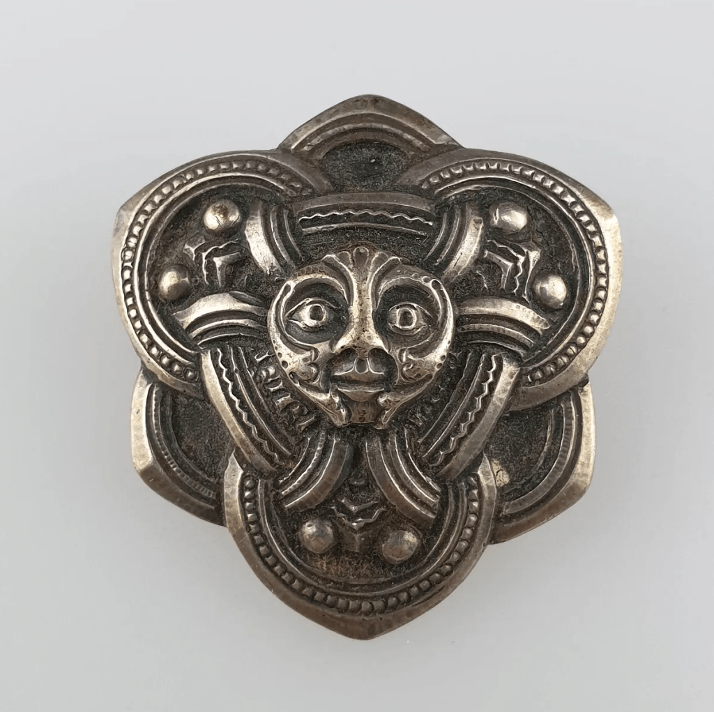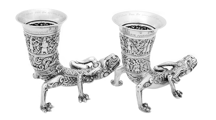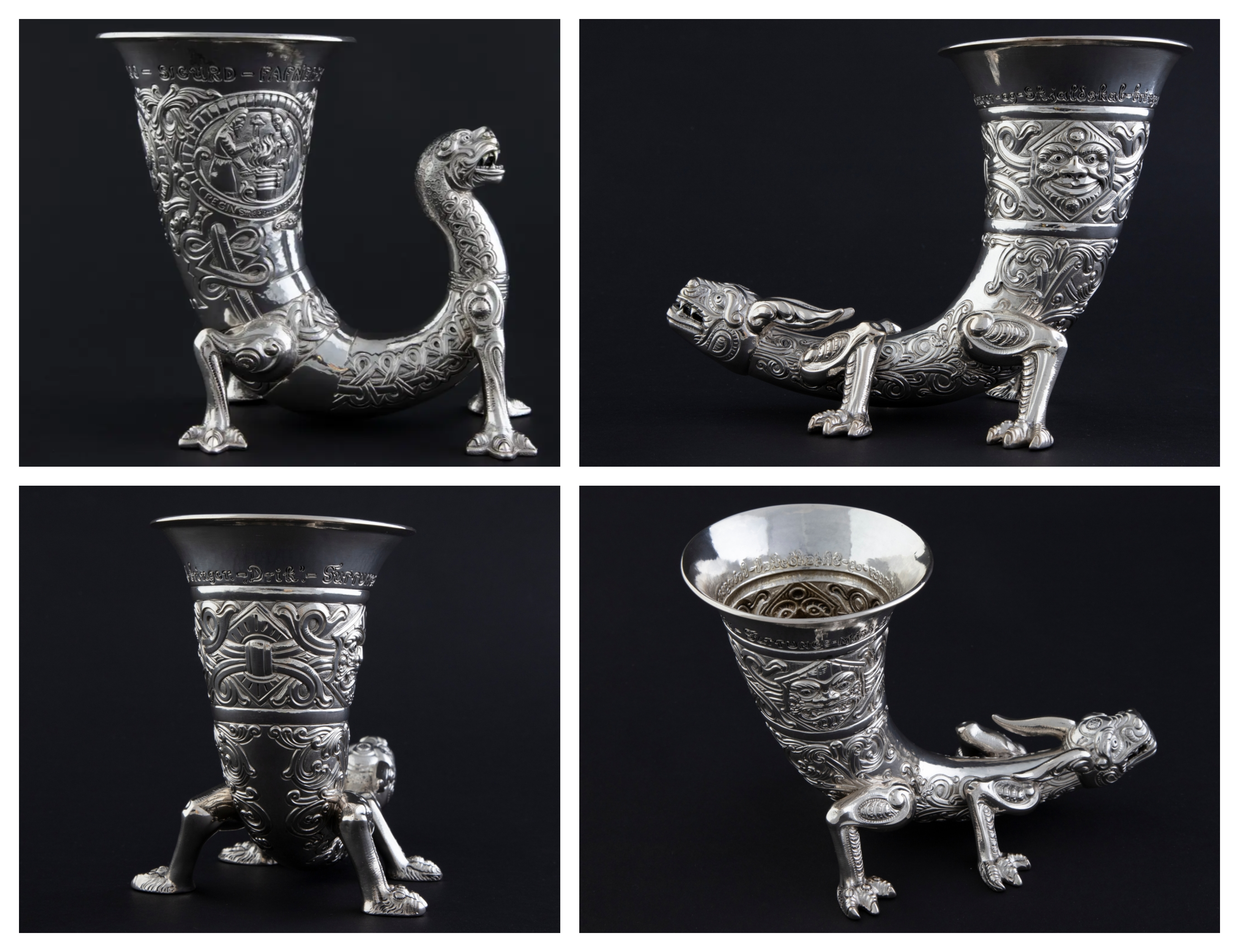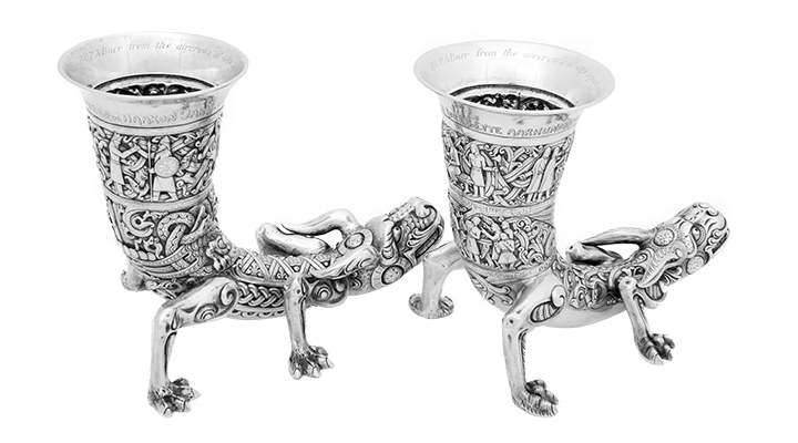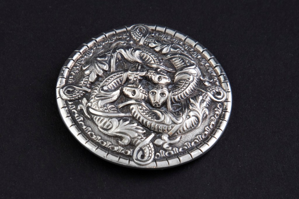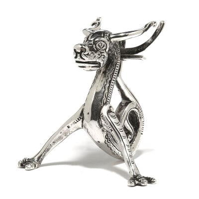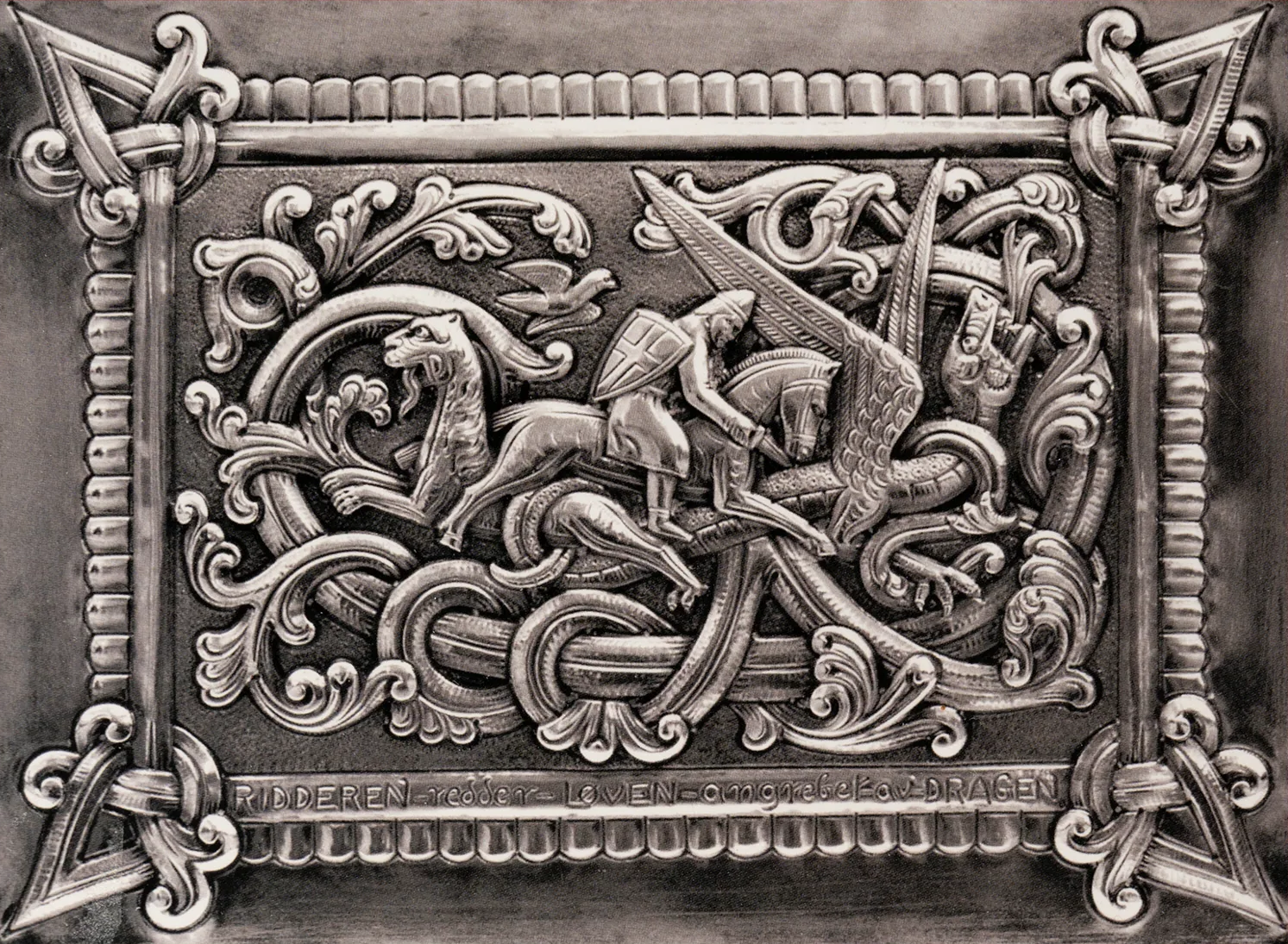 Right up until the 1930s, Møller’s work was characterized by the romantic enthusiasm for the past in the dragon style from the end of the 19th century. Based on his own drawings, he created imaginative works with dragons and other mythical animals, compact tendril and animal ornamentation, motifs inspired by Norse mythology and saga literature, stave churches and Nidaros Cathedral. According to Møller, the dragons symbolized the fight against evil. They can be found twisting along his silver jugs, drinking horns and jewelry. Roaring, biting and a little terrifying in all their beauty, they speak the same language as the heads above the roof in the cathedral.