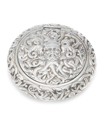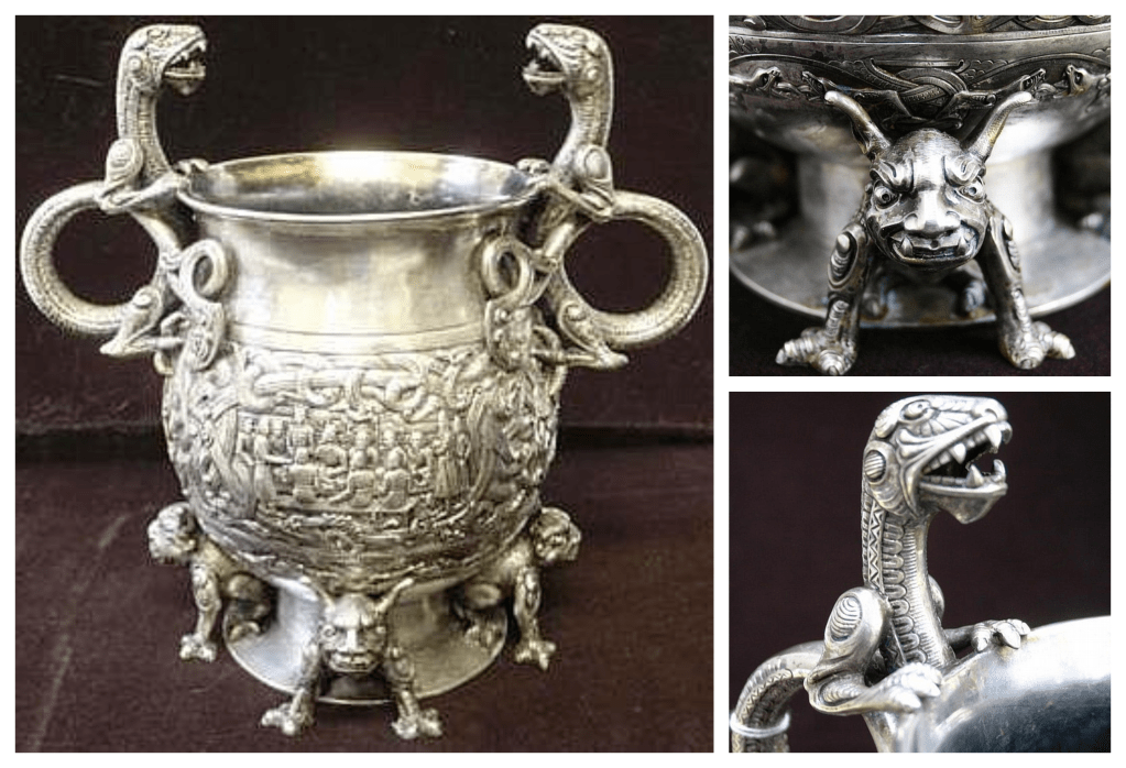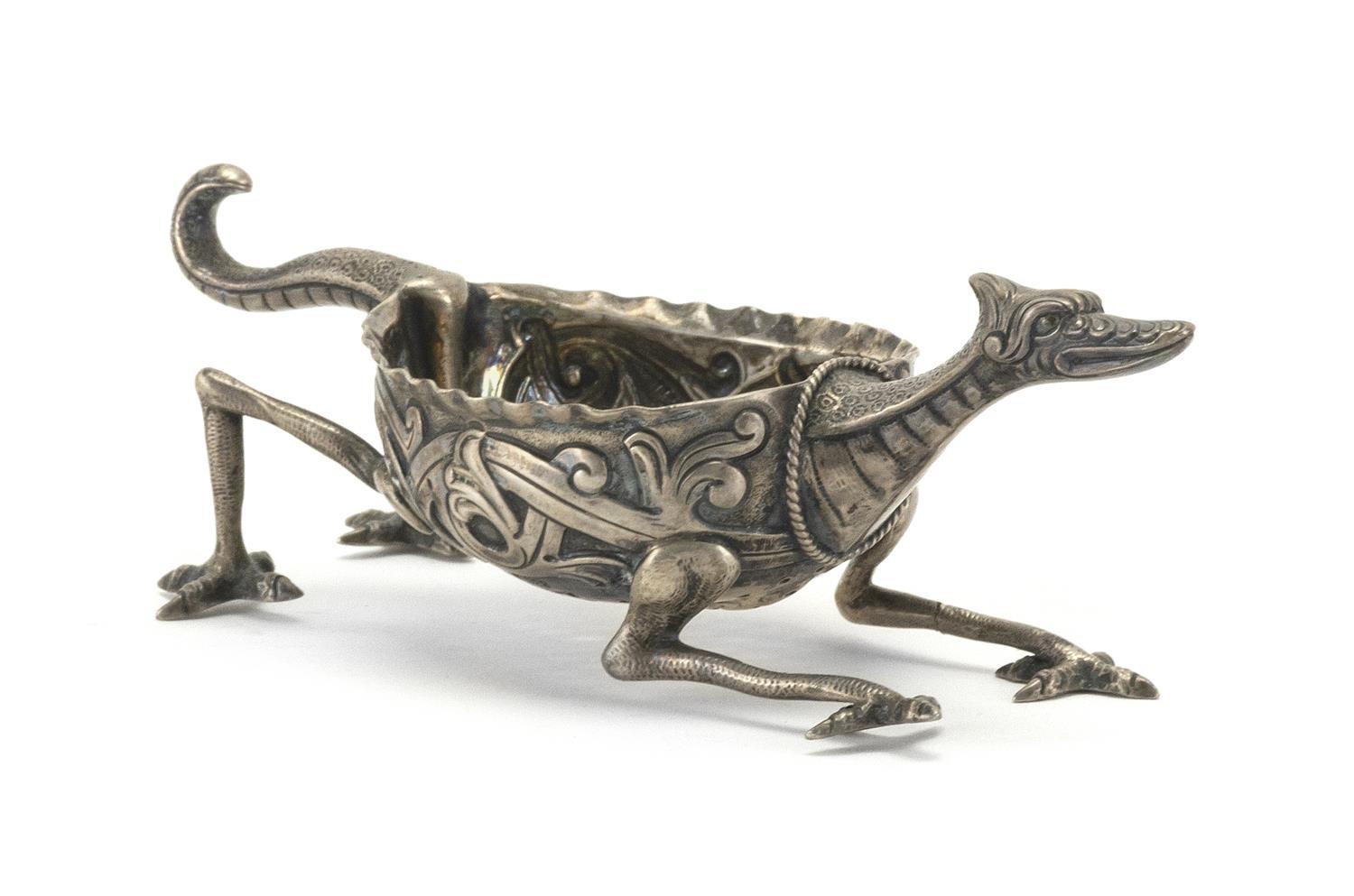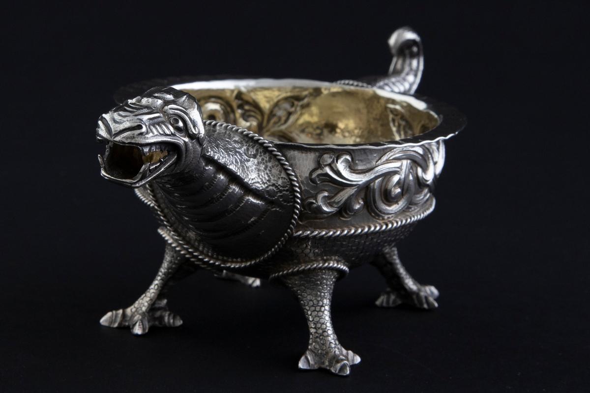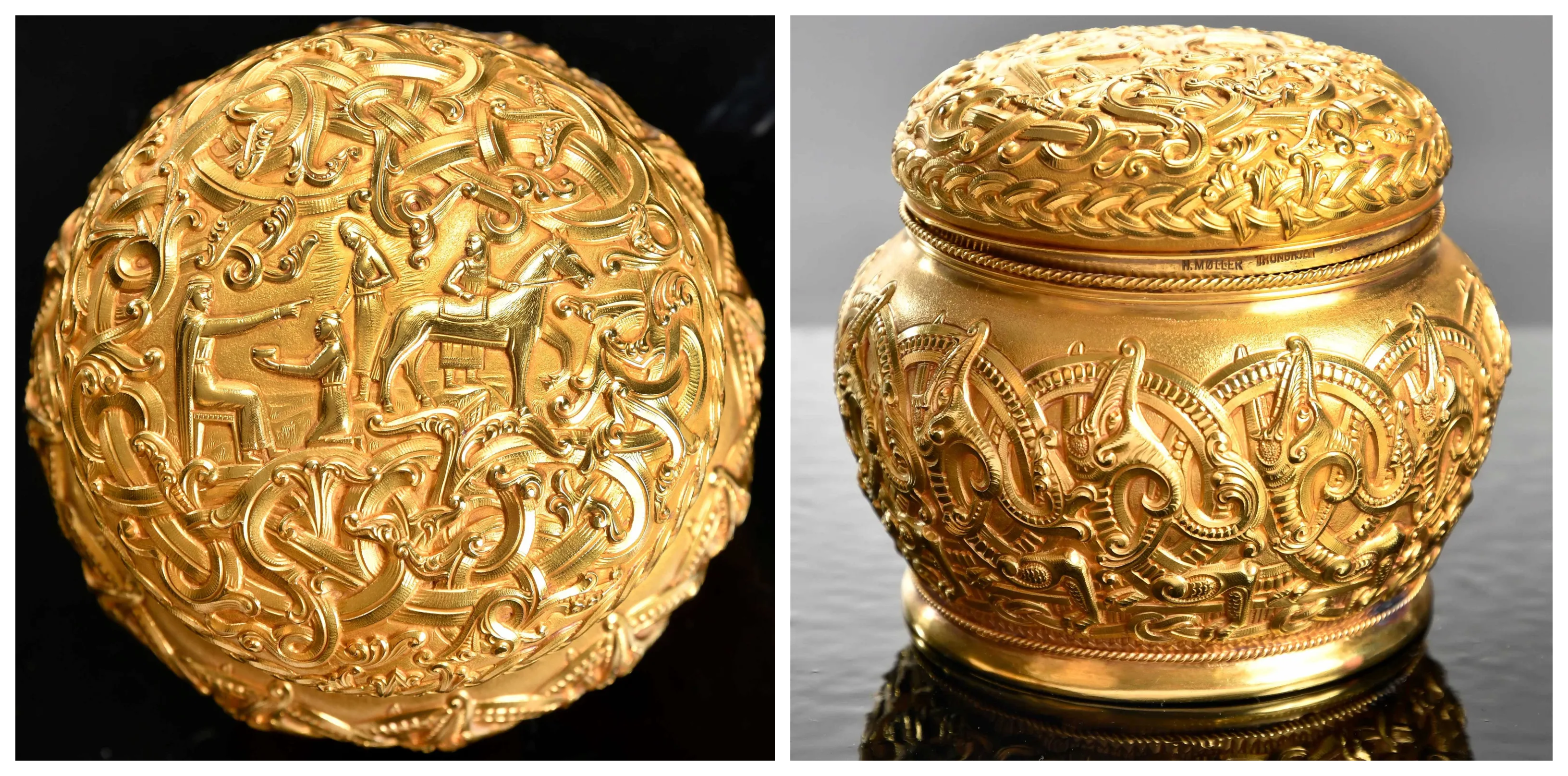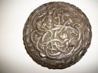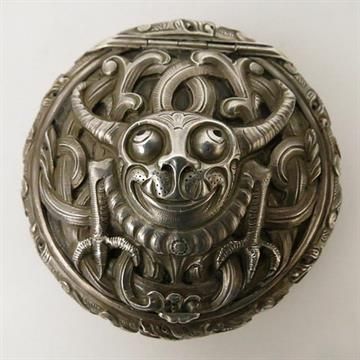 The inscriptions on this silver box can be translated to: “The knight rescues the lion from the dragon. The lion thankfully accompanies the knight. The lion dies of sorrow on the knight’s grave.“