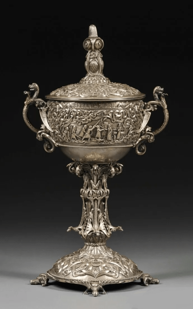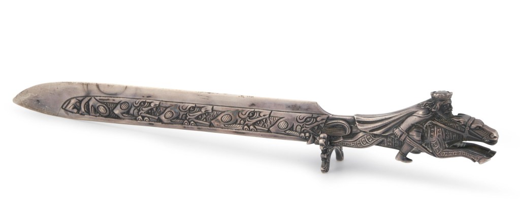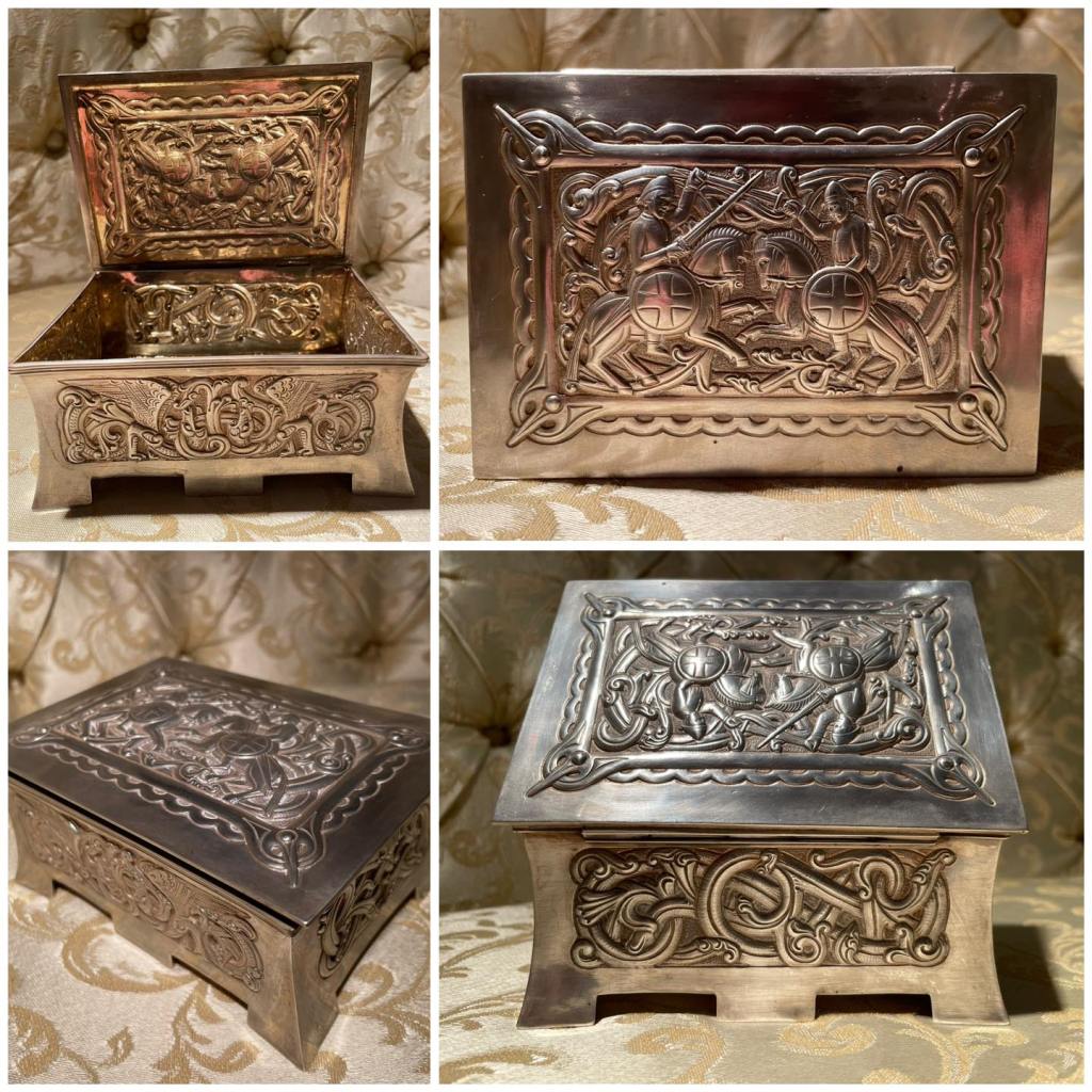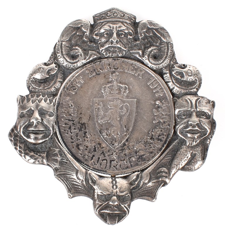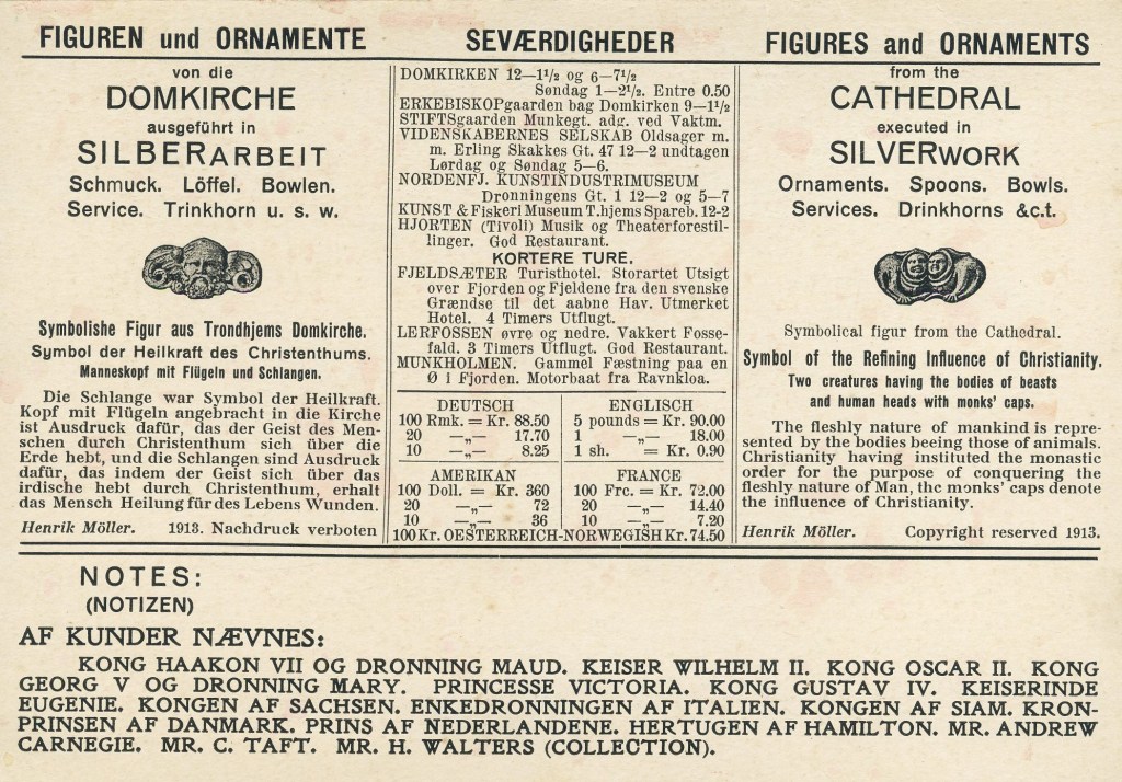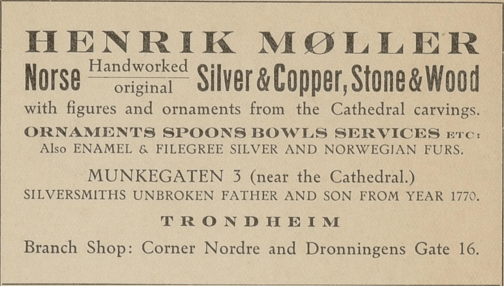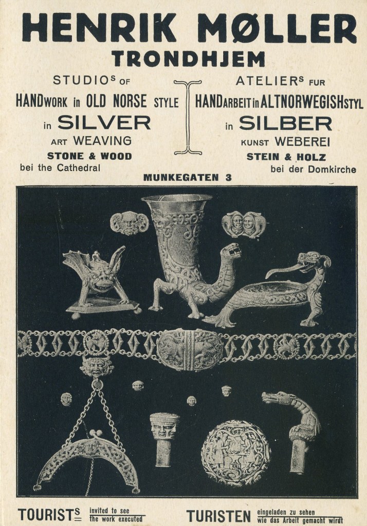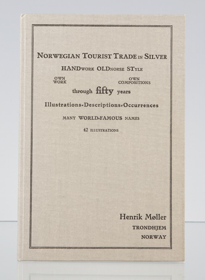 For many years, Møller ran his business and a large workshop in Trondheim with great success. In 1934, Henrik Møller published a richly illustrated, autobiographical book called Norwegian Tourist Trade In Silver. The book describes his life and mentions his most extraordinary works sold to wealthy and royal clients. Møller also details the intentions of his creations: “From the beginning, my efforts were to try to secure tourists as customers and awaken their interest by presenting objects in original artistic handwork according to my own designs, chiefly in old Norwegian style, hammered by hand, embossed and chiselled work, objects decorated with scenes, ornaments, and images from old Norwegian mythology, sagas, and decorations.” (Halén 1992, p. 25).