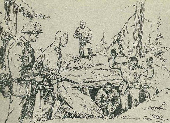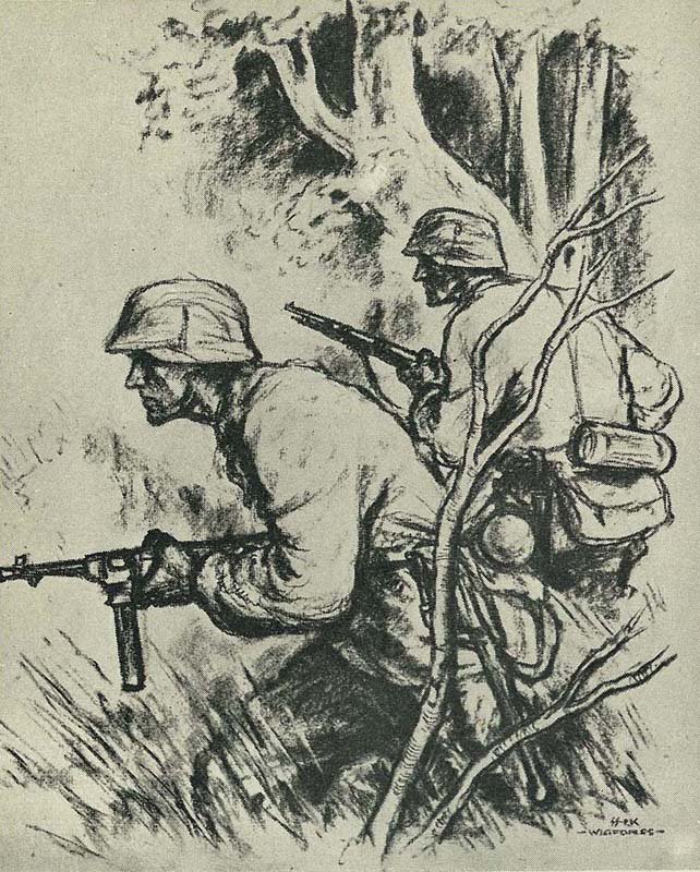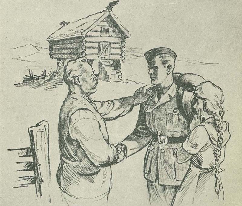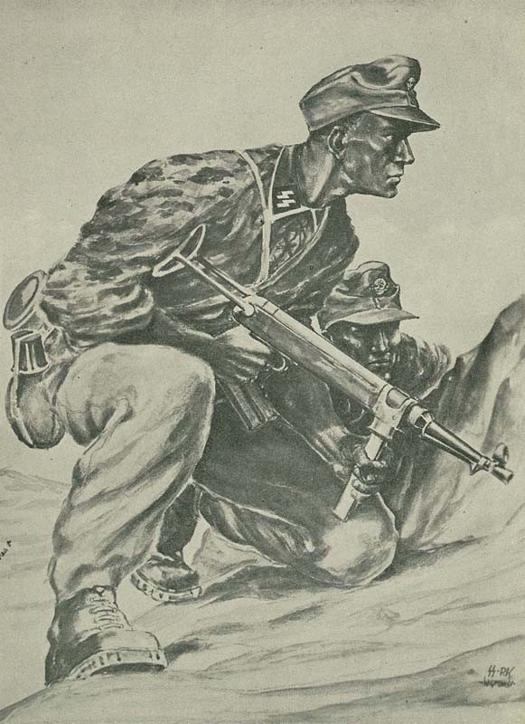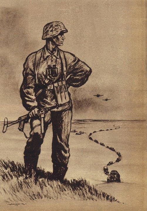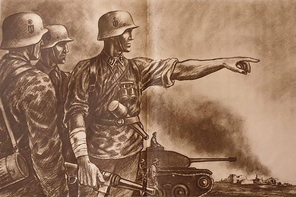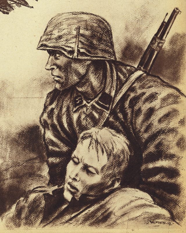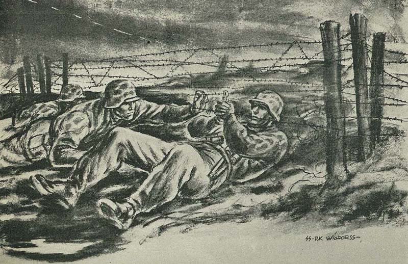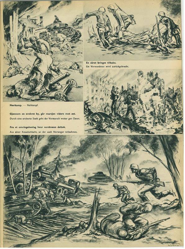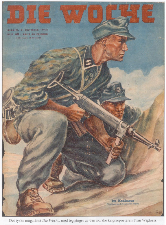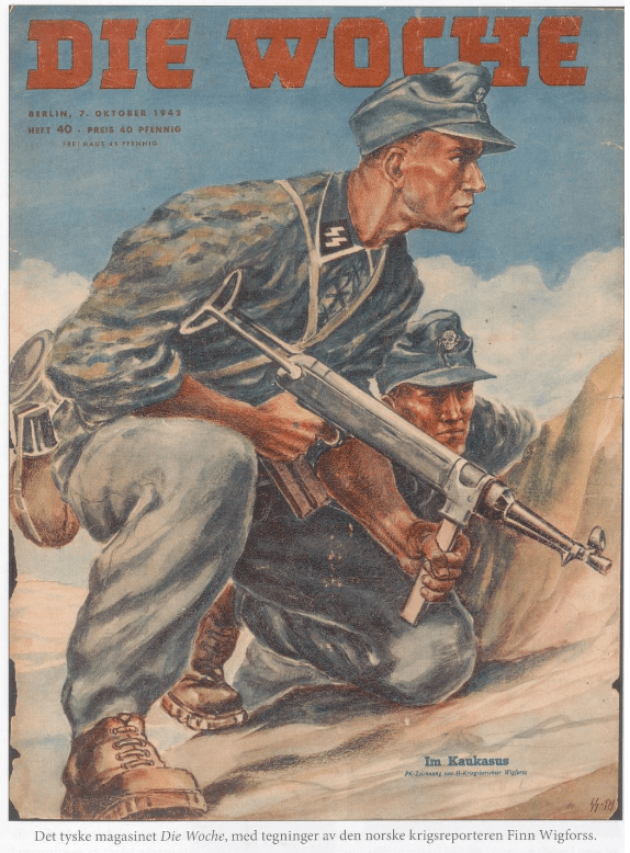 In 1941 Finn Wigforss volunteered for the SS Volunteer Legion “Norwegen” and was soon sent to the Eastern Front as a war correspondent (Kriegsberichter) and artist in the rank of Untersharfuehrer. While serving with the “Das Reich” Division of the Army Group Guderian, he was with the SS-Kampfgruppe which came the closest to Moscow. Soon he became quite popular – his drawings were often published in Norwegian military journals.