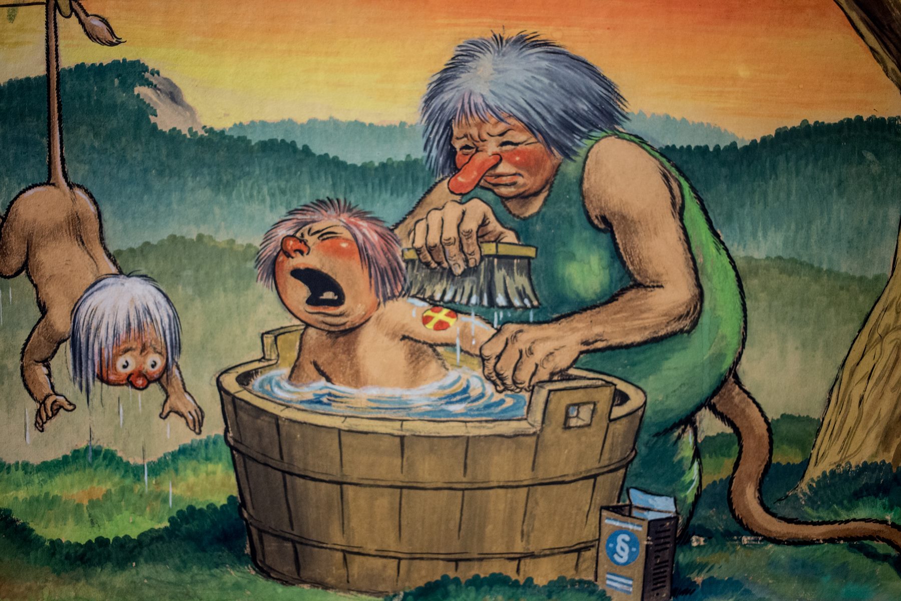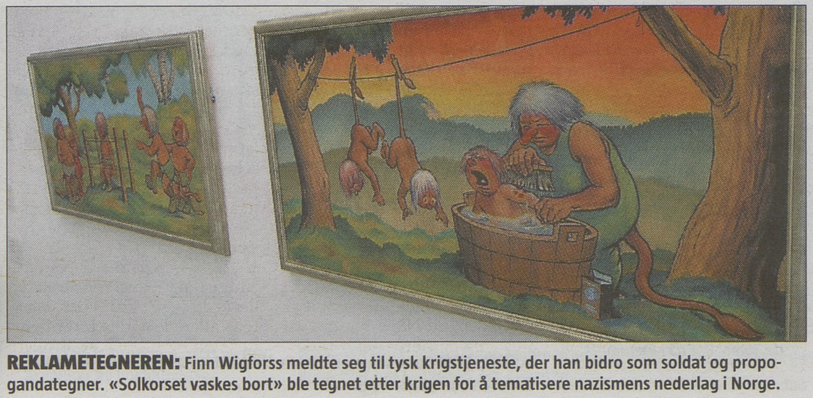 In 1945 Wigforss also produced a drawing entitled Solkorset vaskes bort (The Sun Cross is washed away). The sun cross symbol was used by the Norwegian Nazi party Nasjonal Samling (NS) during World War II. In this drawing Wigforss illustrates his own situation in 1945. He depicts NS members as trolls that are hung out to dry after their mother (which could refer to Norway) has cleansed them of their sun cross marking.