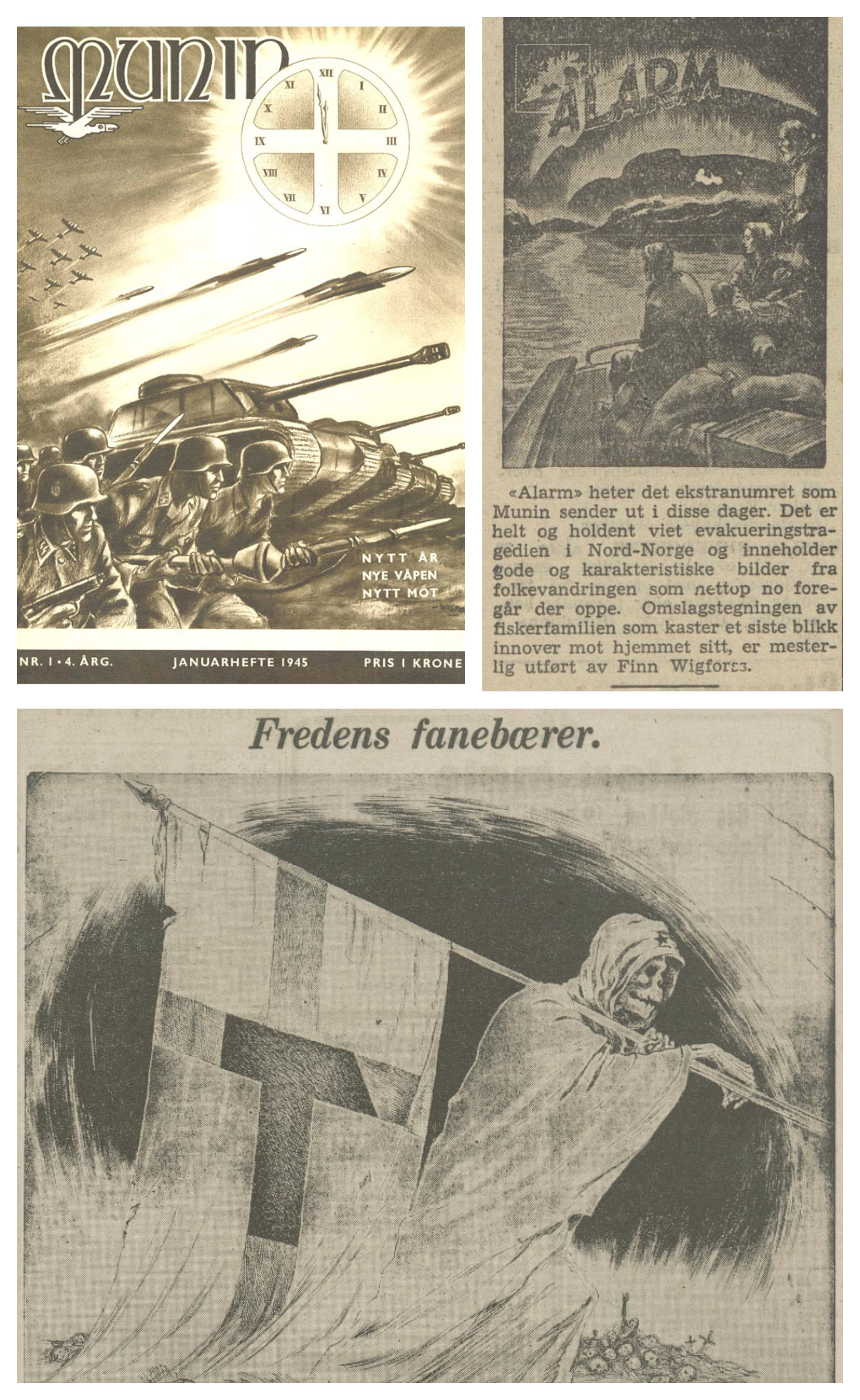 By the end of 1943, graphic works by Finn Wigforss appeared in numerous German and Norwegian magazines (Munin, Nordlandir, Fritt Folk, etc.).