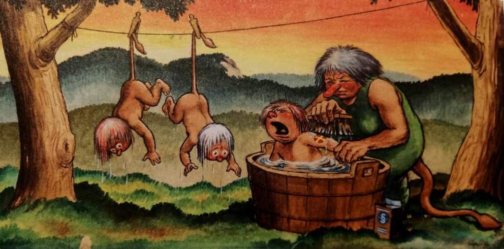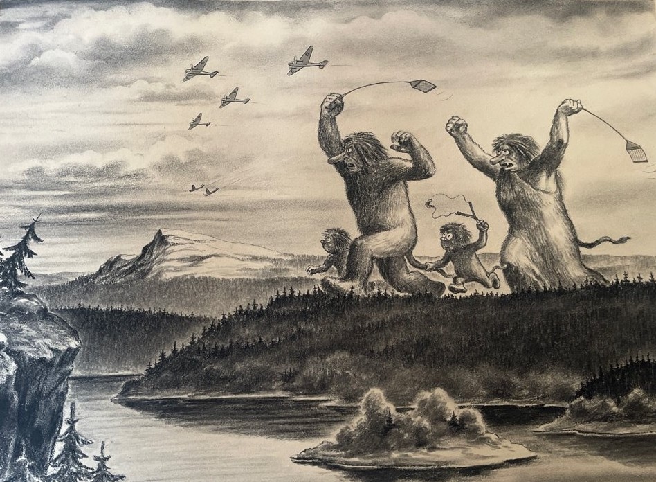 In 1945 he reproduced his iconic Norwegian troll postcard drawing, only this time he depicted a family of Norwegian trolls chasing away German bomber planes (identified by the iron cross symbol on the wings).