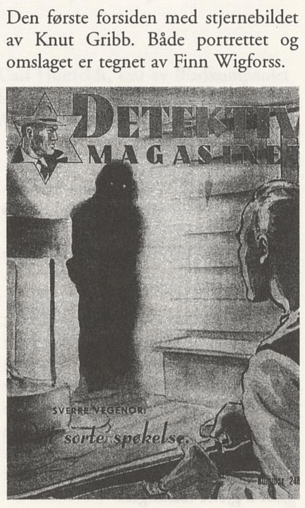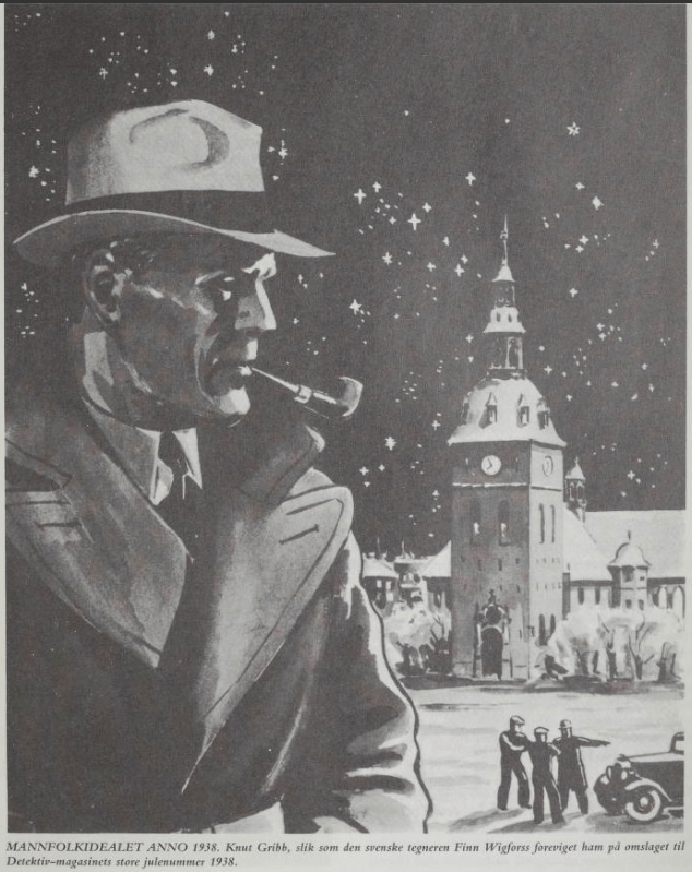 In 1938, Detektiv-magasinets jubileumsnummer (Detektiv-magasinet’s anniversary edition) was published on the occasion of the magazine’s 10-year anniversary. It was in double format, and Finn Wigforss created the iconic cover which depicted Knut Gribb with a pipe in his mouth and the Cathedral on Stortorget in the background.