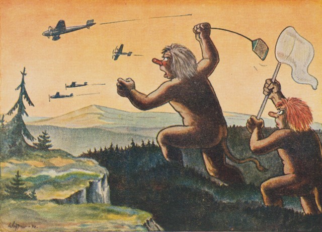 When Germany occupied Norway in 1940, Finn Wigforss created the propaganda postcard (published by Stranberg & Co, Serie 2035) entitled “Troll jager fly” – Trolls chasing planes. The postcard depicts two mythical trolls, supposedly Norwegian and German, hunting for British bombers. Over the years it has been misinterpreted by collectors as Norwegian trolls chasing away German planes and was long thought to be made by the Norwegian resistance.