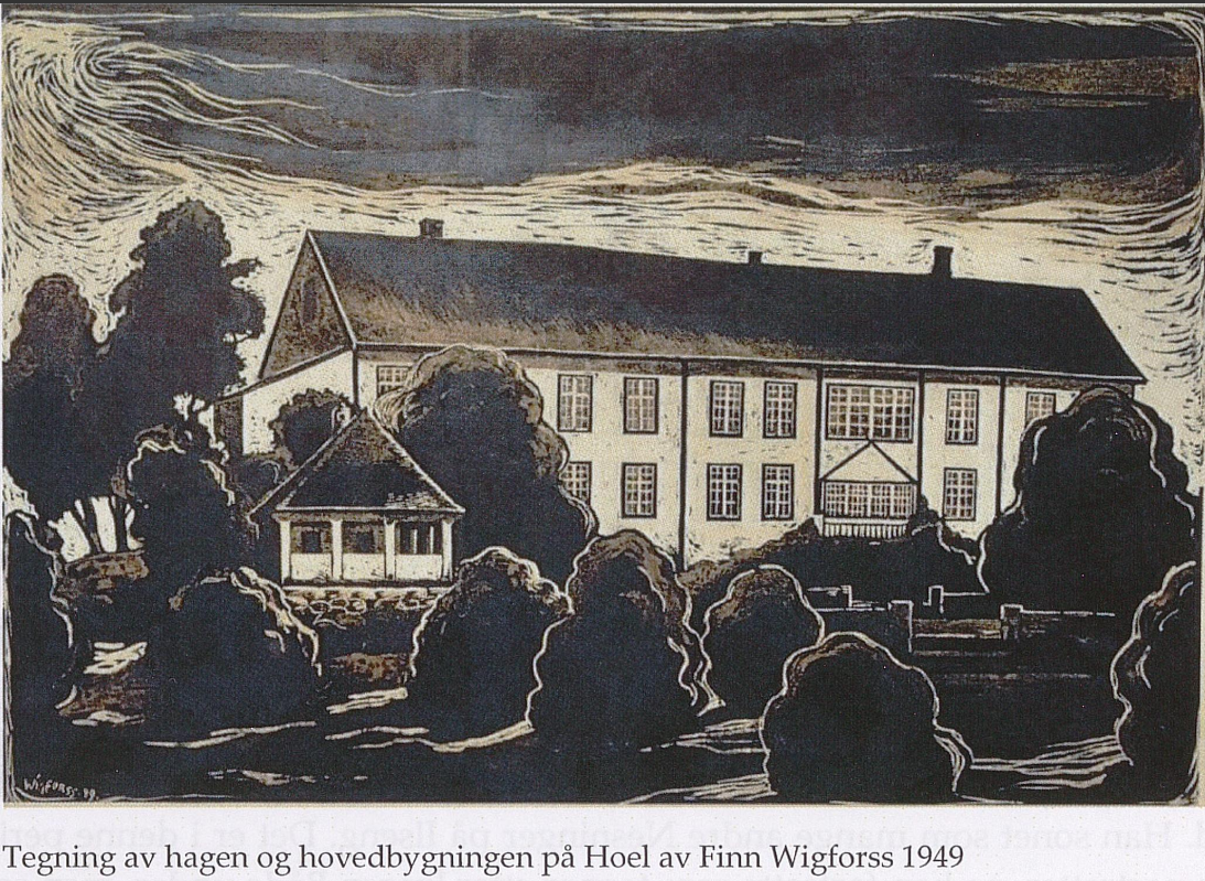 After he was released, there is barely any mention of him in the Norwegian library archives. He made this drawing of the garden and the main building at Hoel in 1949: