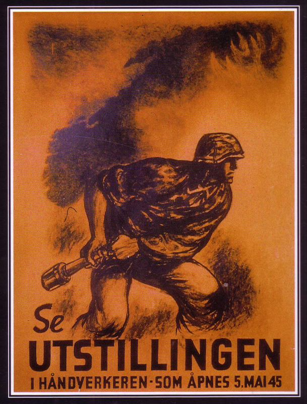 In the last days of the war, 5 May 1945, an exhibition of the fighters of the front under the motto “Norway calls” was inaugurated in Oslo, directed by the general manager Øystein Orre. The central theme of the exhibition according to what was reported by the newspaper “Fritt Folk” was “the fighters of the front fought for the cause of Norway“. Finn Wigforss, Harald Damselth, Guttorm Pedersen and many other Norwegian artists took part in the exhibition which was opened by the head of the “Frontkjemperkontoret” (Front Fighters Office) Bjørn Noreger and Police Minister Jonas Lie. The exhibition lasted only three days because on 8 May 1945 Germany signed the capitulation.