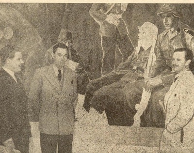 Pictured in the background is an unfinished painting by Finn Wigforss. Image taken from the National Socialist newspaper “Fritt Folk”. From left, exhibition general secretary Øystein Orre, Front Fighters Bureau chief Bjørn Noreger and artist Harald Damsleth. Source: Thule Gallery