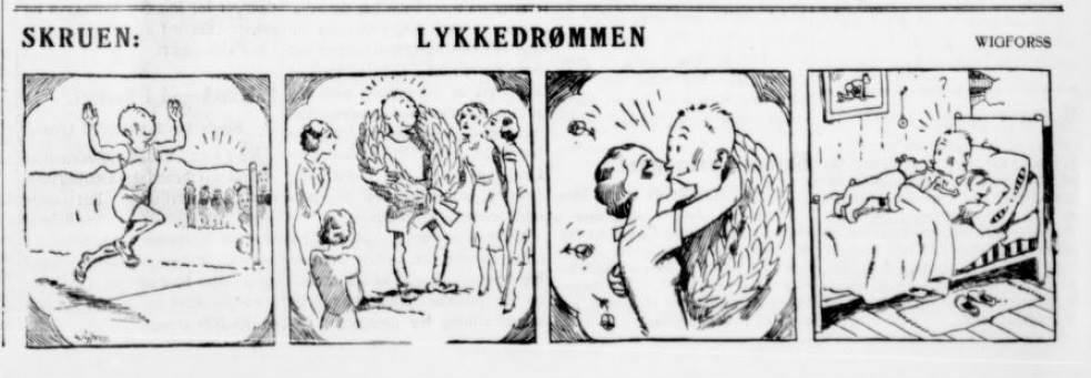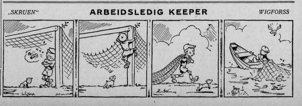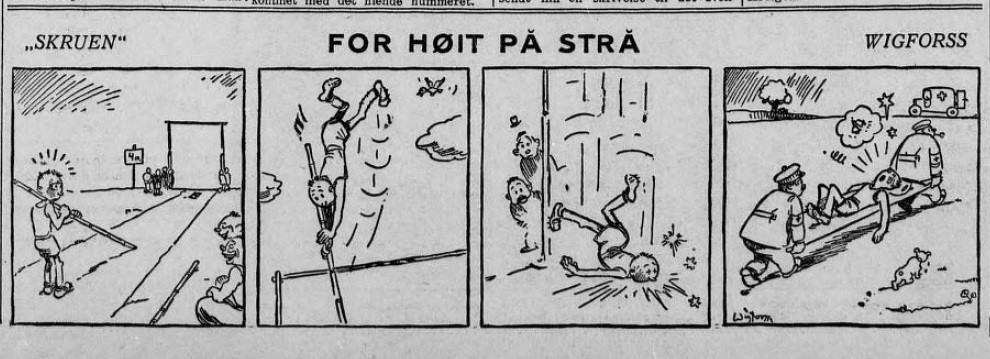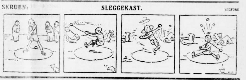 “By all accounts, “Skruen” is the first Norwegian sports cartoon. The main character in the cartoon was Skruen, who found himself in humours contexts when trying his hand at various sports. He had little luck from strip to strip. Like a number of Swedish and Danish newspaper cartoons from the time, “Skruen” was without text.” (Kristian Hellesund, 2016).