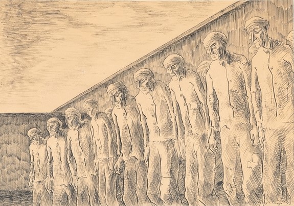 “At the gate” – A contemporary depiction from Sachsenhausen by Erik Wengelin. They just stood there, in scorching sun or in rain or freezing cold, until finally the Lagerführer saw fit to receive them to pass the final verdict.