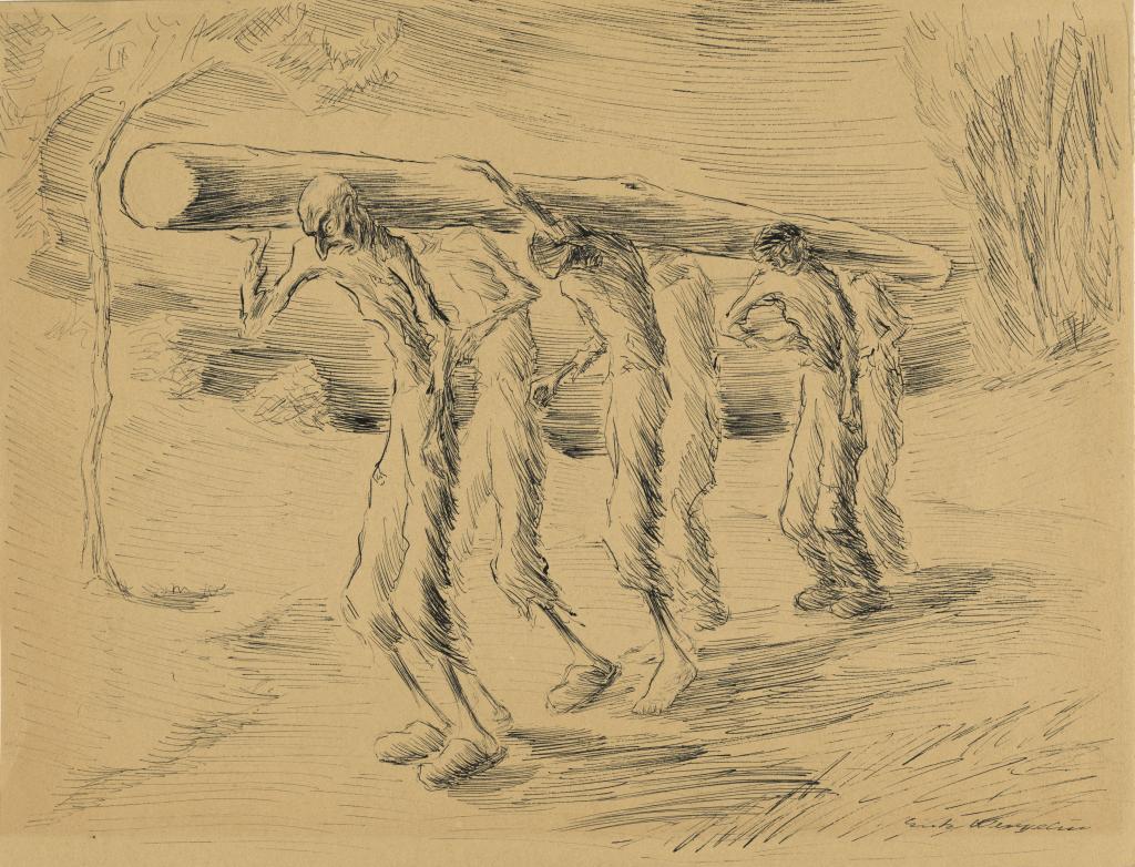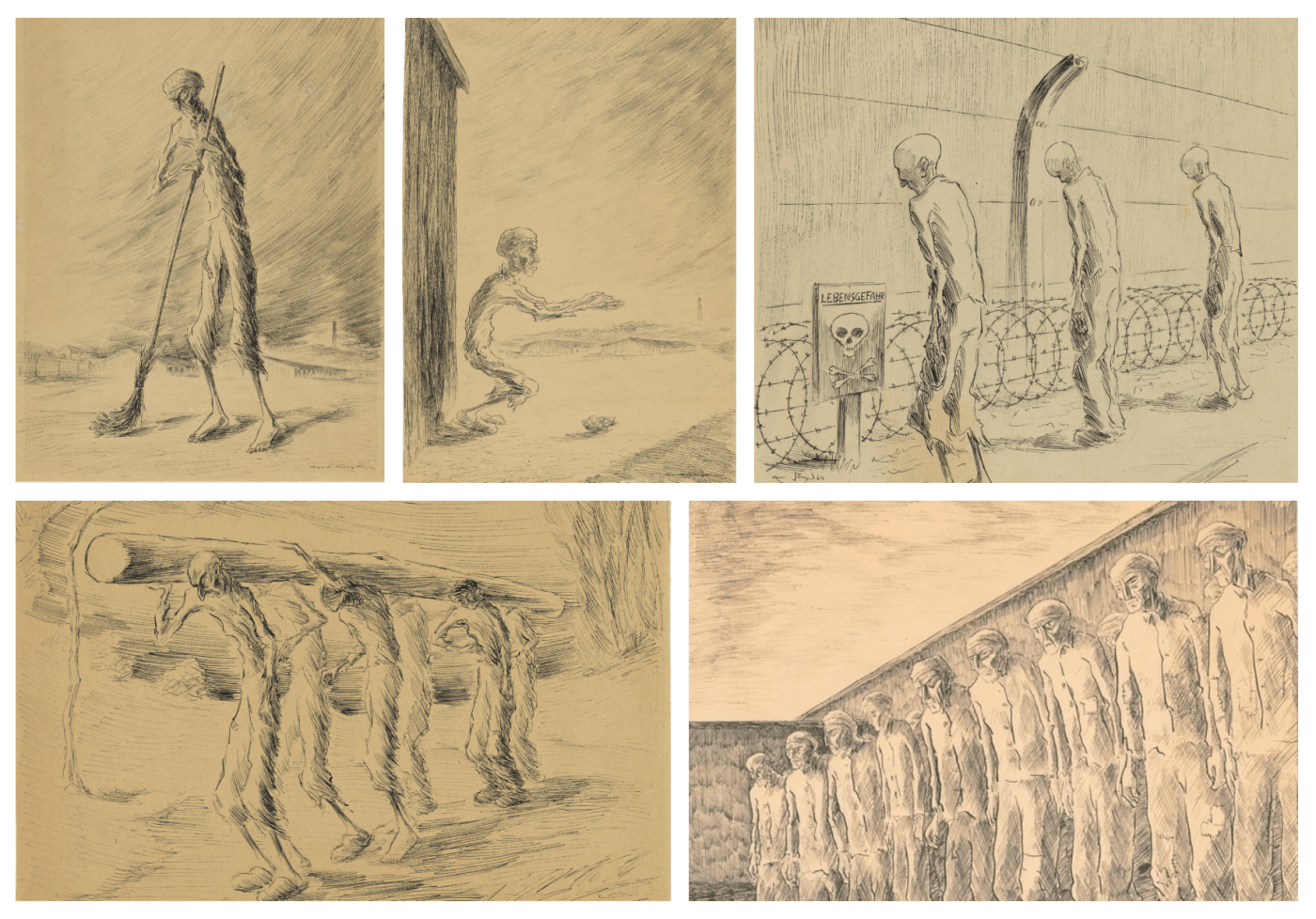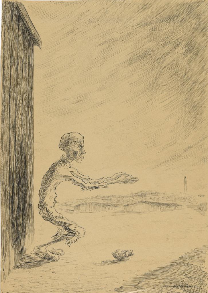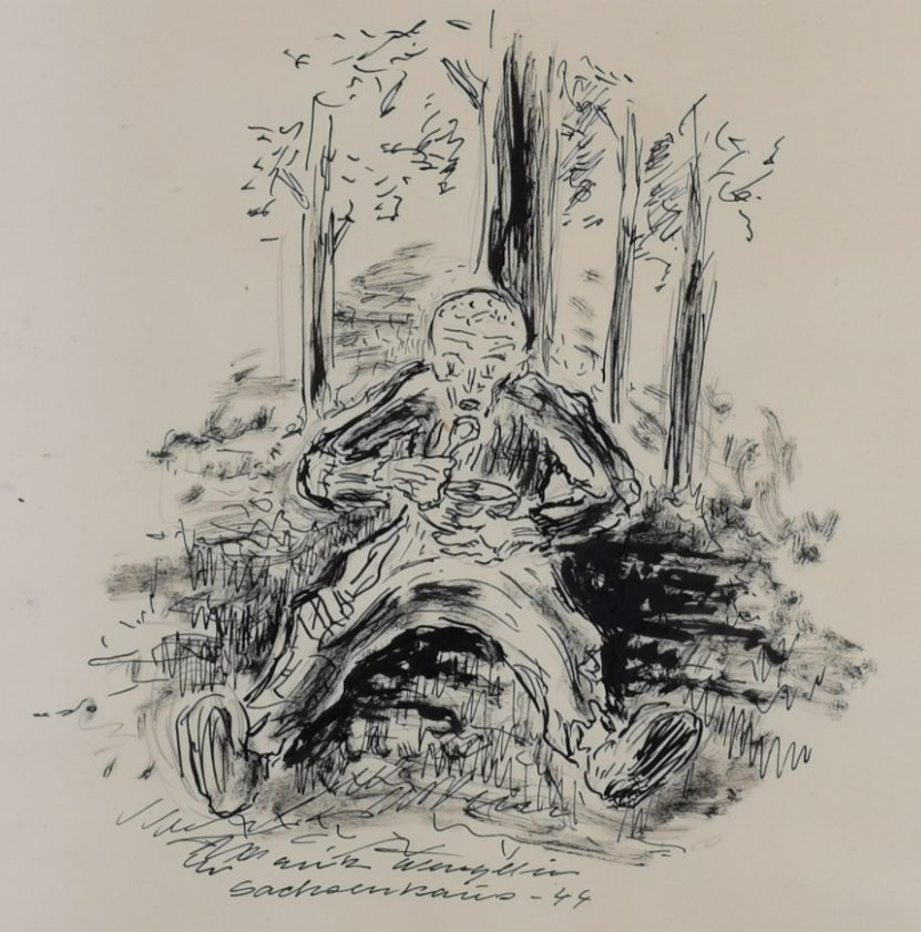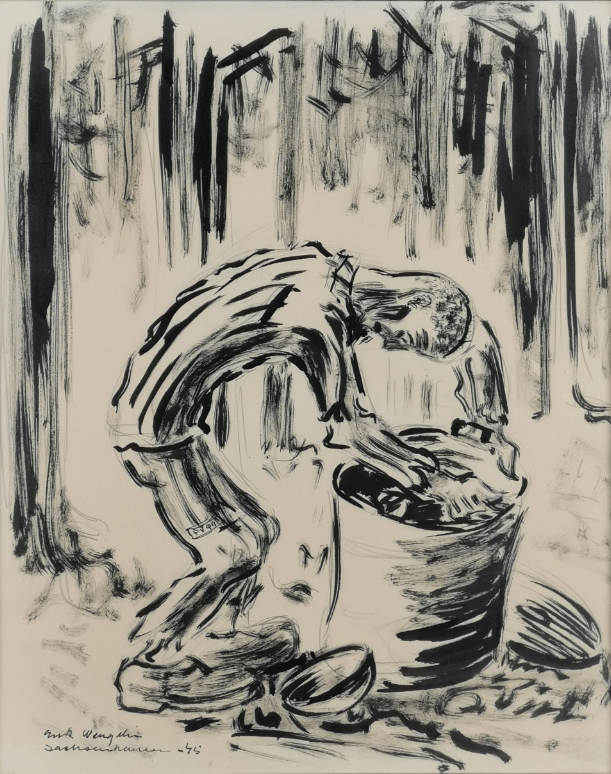 Erik managed to survive the cruelty and harsh conditions of the camp. He remained in Sachsenhausen until he was liberated at the end of the war. In 1945 he created a collection of drawings depicting his experience at Sachsenhausen. For these he used pen over pencil on vellum paper.