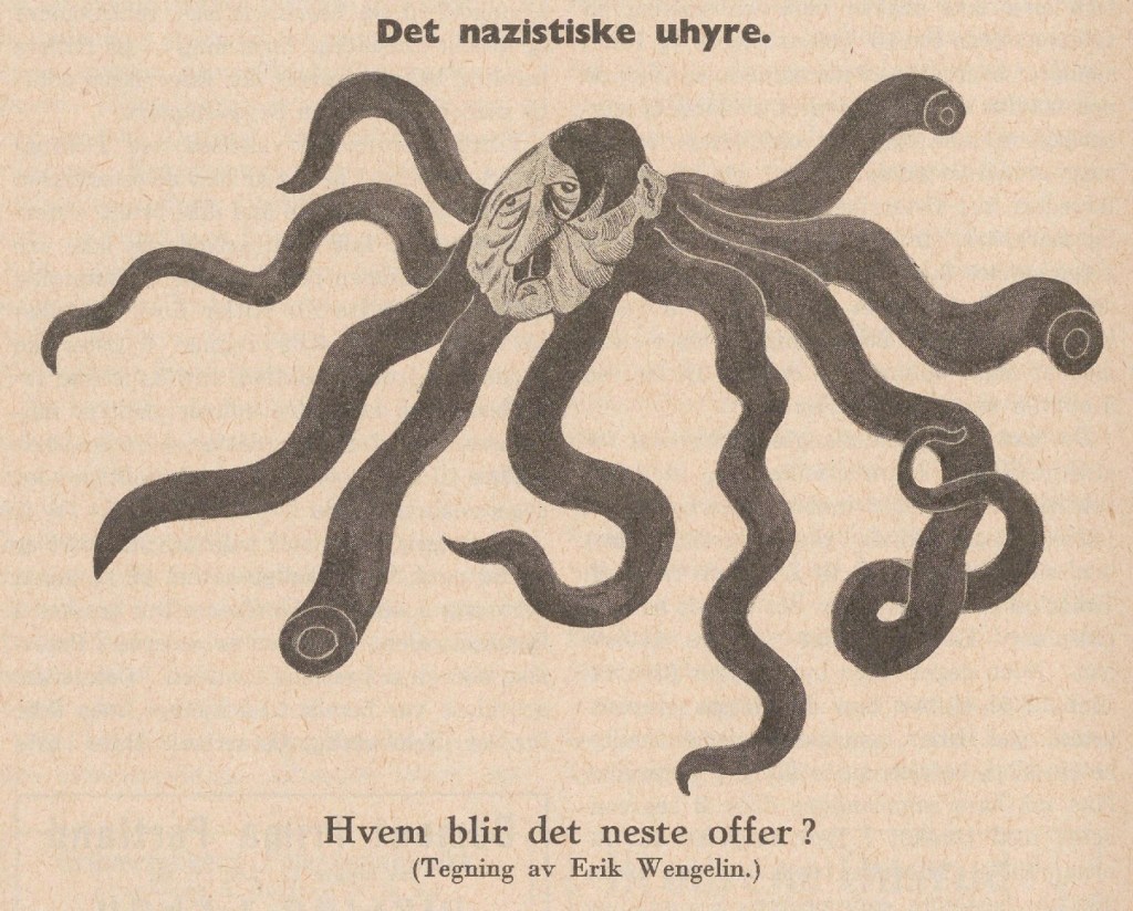 In Bygningsarbeideren (Norwegian construction industry workers’ union). 1938 Vol. 16 No. 5, Wengelin drew the following depiction of Hitler with the caption: “The Nazi monster. Who will be the next victim?“. The drawing appeared at the end of an article about this event with the title “Did Austria fall into Hitler’s hands?”.