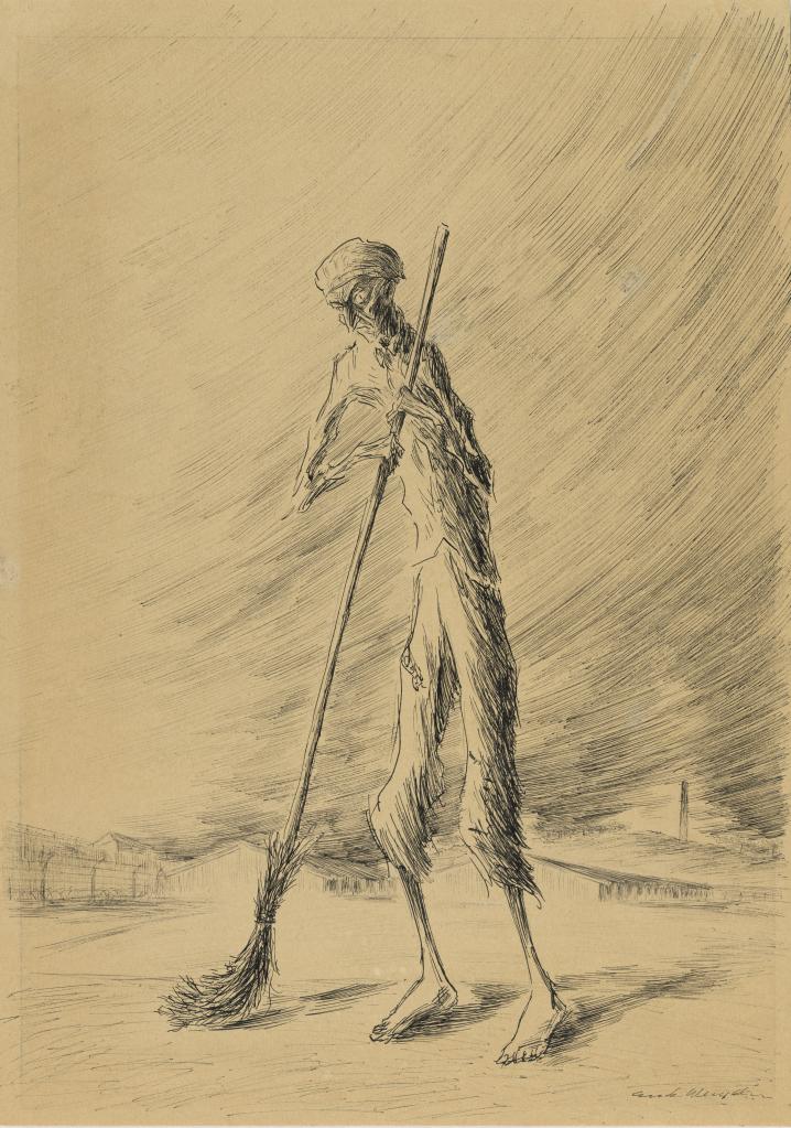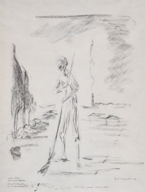 There is evidence of his work up until 1962. He sketched the following image with the title: “Wier sweeping with the broom (Muslim man from Sachsenhausen contentration camp) with a dedication: Til vaar gode venn Odd (To our good friend Odd).