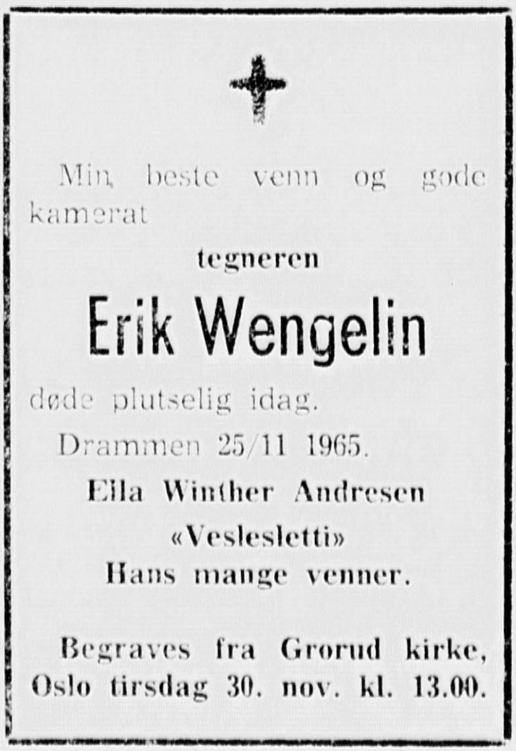 On 25 November 1965, Erik Wengelin passed away in Drammen after suffering a heart attack. He was 58 years old.