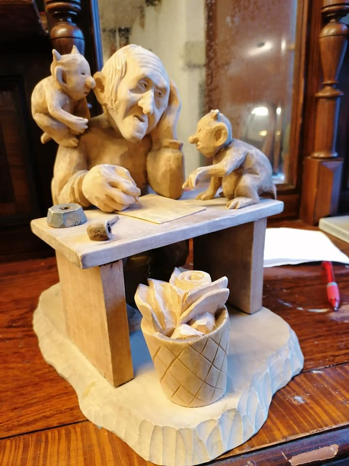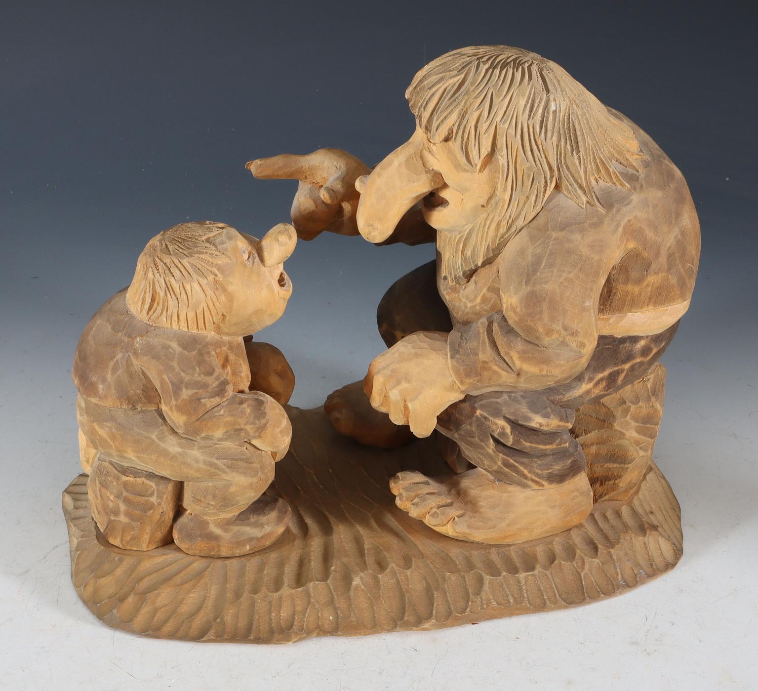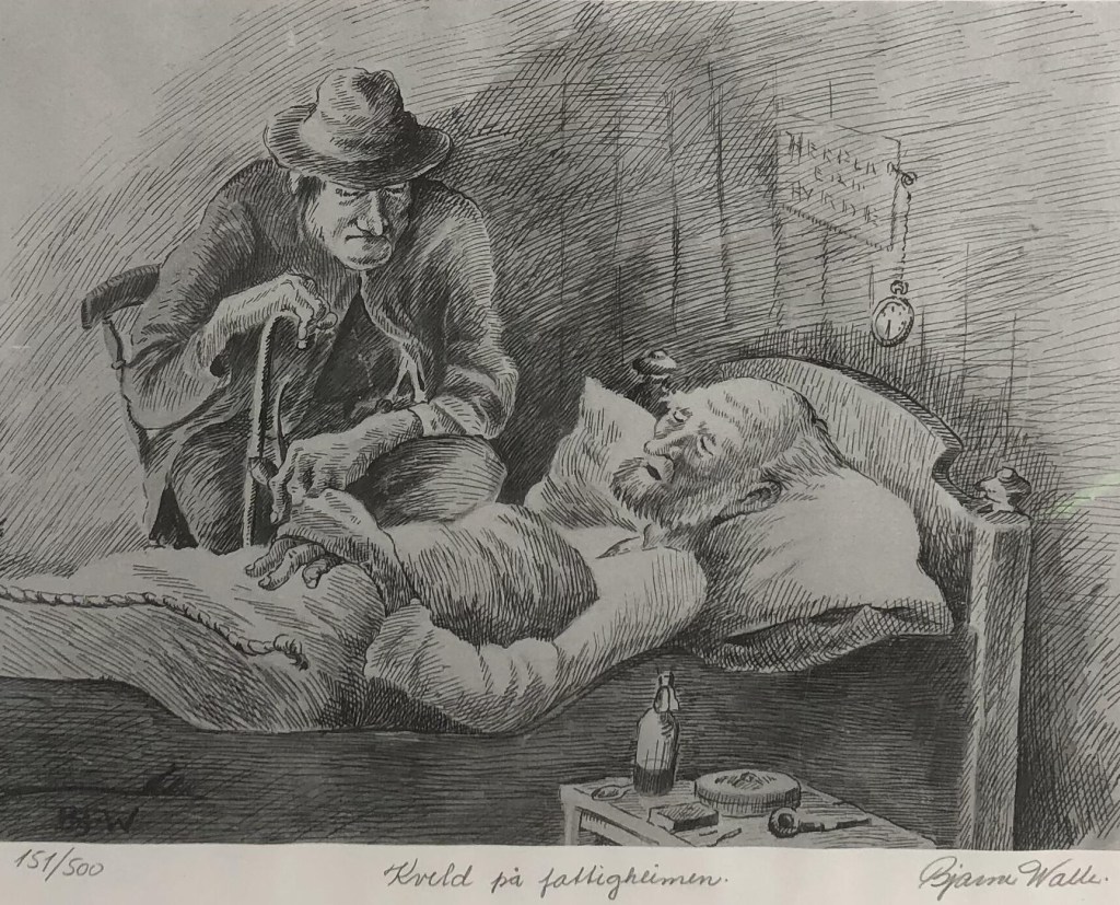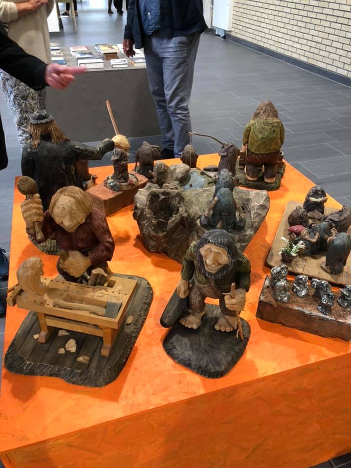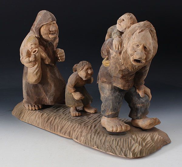Marit Walle speaks about her father: “His books were first written out in the workshop among knives, wood chips, bears, moose, trolls, old women and old men in wood. He carved sculptures, most of them in humorous situations. But there were also many of the wildlife in Norwegian forests, and then the trolls. He had many exhibitions, not only at the Trade Convention, but also in Denmark, and many carvings were sold to the USA and Germany.”