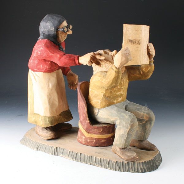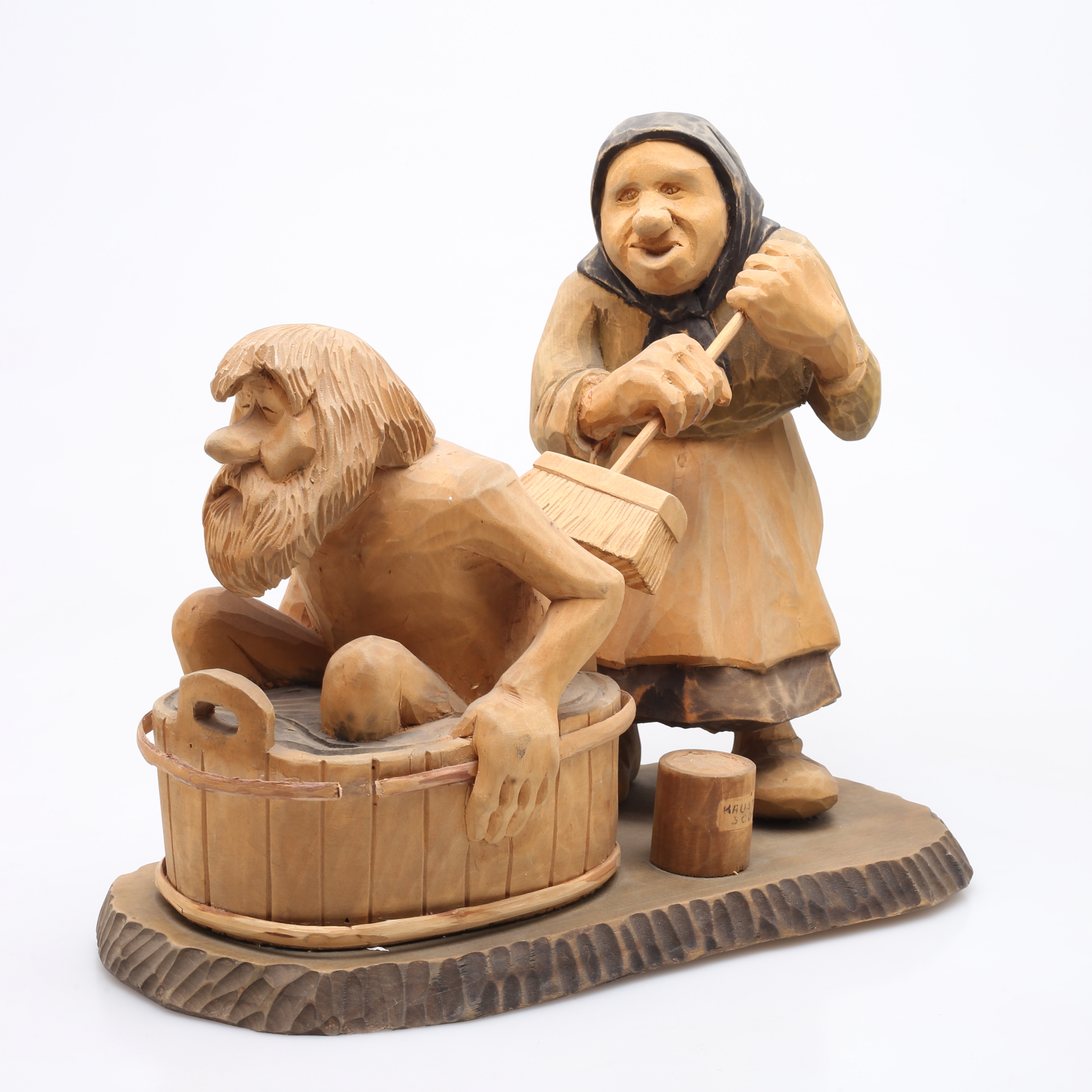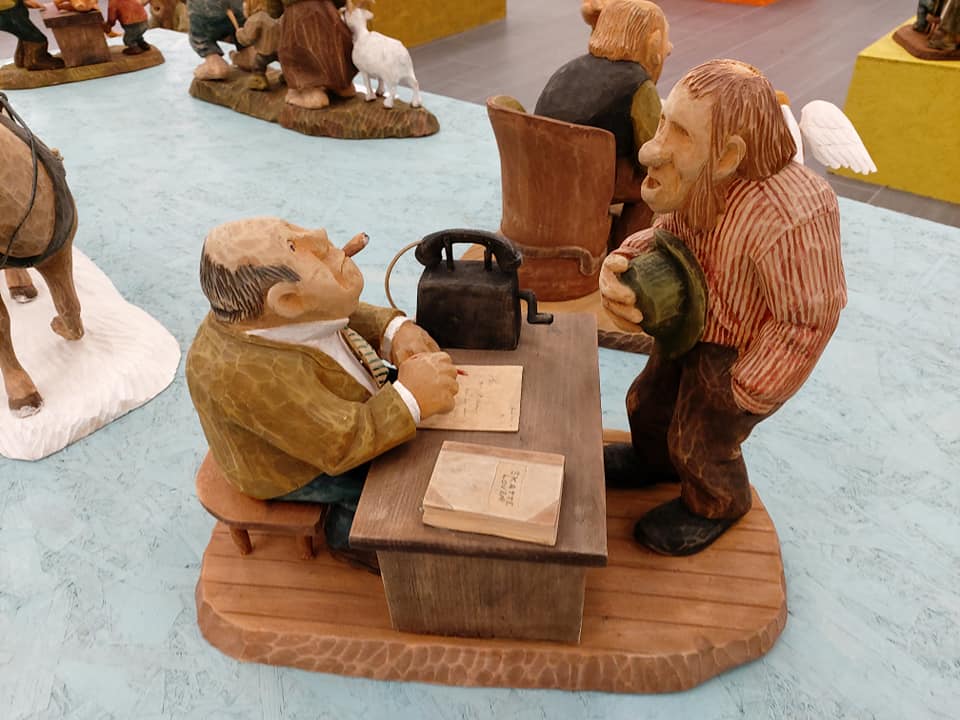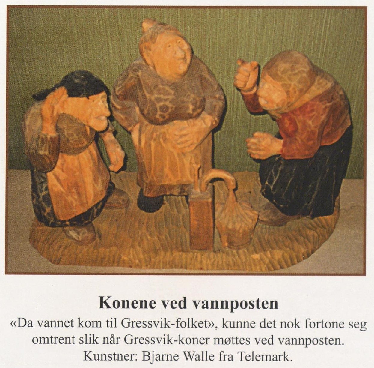 Marit Walle speaks about her father: “His books were first written out in the workshop among knives, wood chips, bears, moose, trolls, old women and old men in wood. He carved sculptures, most of them in humorous situations. But there were also many of the wildlife in Norwegian forests, and then the trolls. He had many exhibitions, not only at the Trade Convention, but also in Denmark, and many carvings were sold to the USA and Germany.”