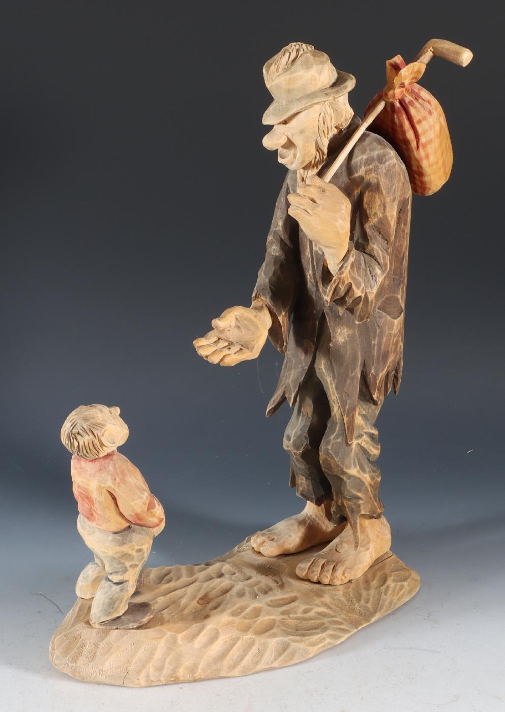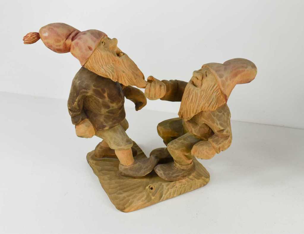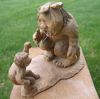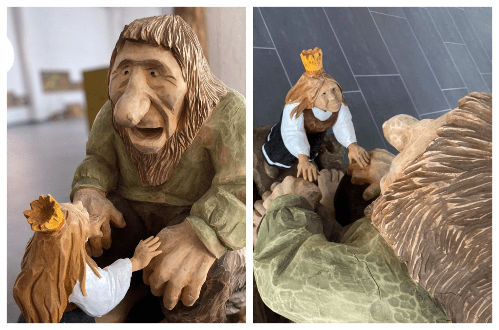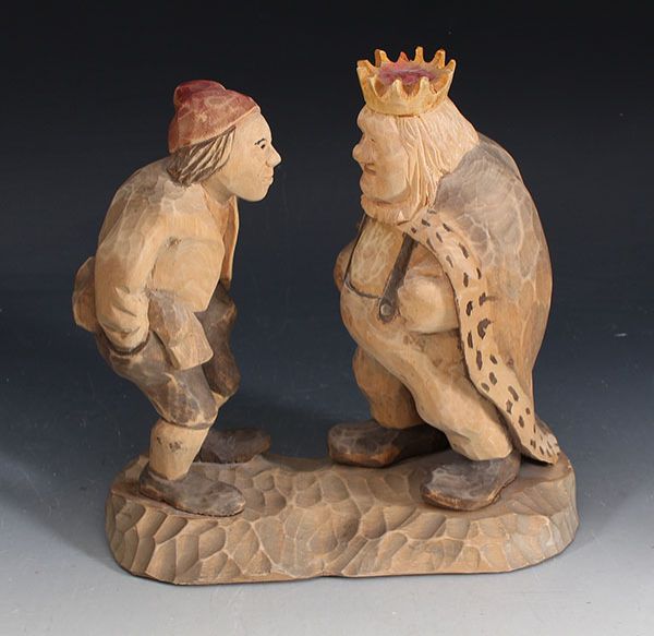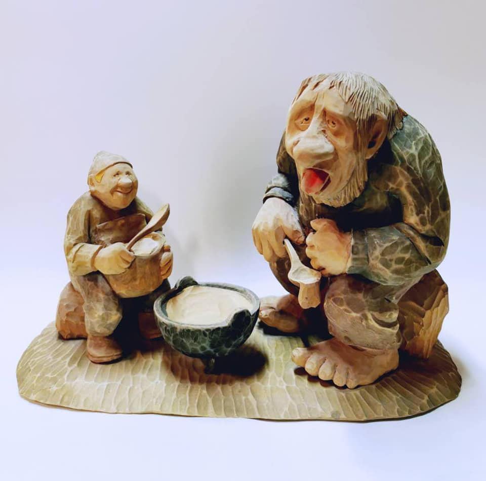 My personal favourite Bjarne Walle carving is the one that depicts the Norwegian fairytale about The Boy Who Had an Eating Match with a Troll (Norwegian: Askeladden som kappåt med trollet). This story was collected by Asbjørnsen and Moe during their travels in Norway. The troll is, as commonly depicted, not very intelligent and has poor vision, while the boy is clever, outwitting the troll to win an eating contest.
