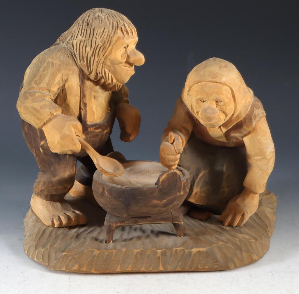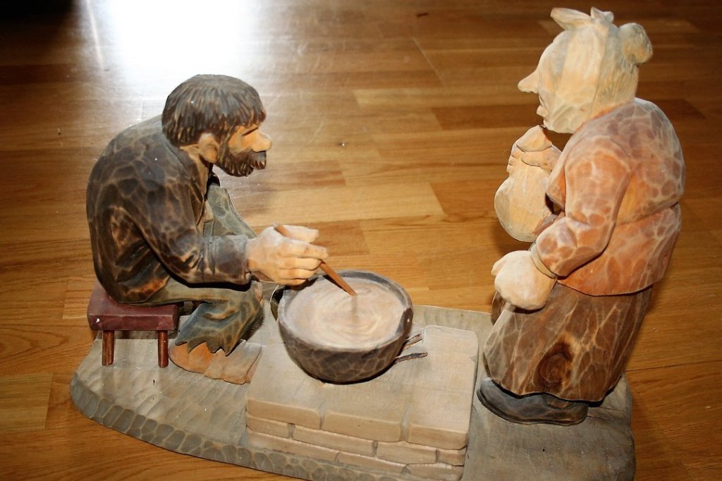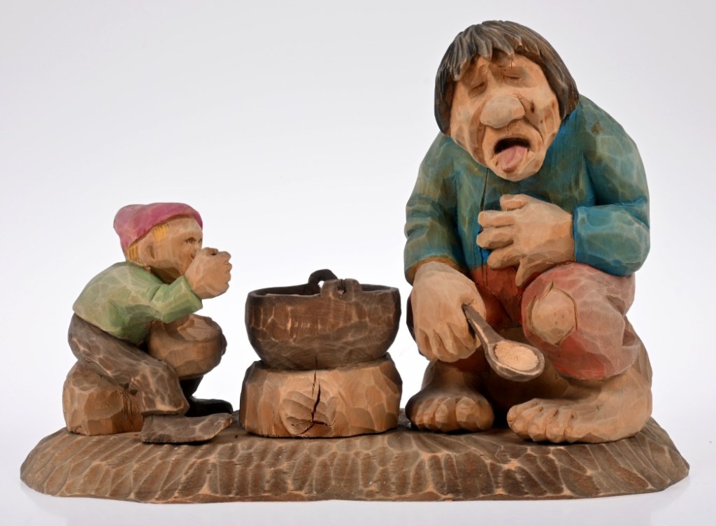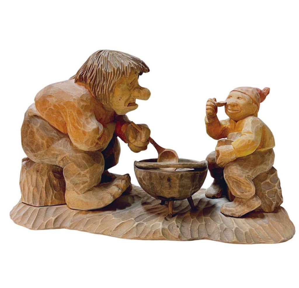 Askeladden (Ashlad) finds himself trapped in a cave with a troll who plans to eat him. After some quick thinking, he challenges the troll to a porridge eating contest. The troll has bad eyesight and Askeladden straps his backpack to the front as you can see in the carving. He tricks the troll by pretending to eat the porridge, but instead he uses the spoon to pour the porridge into his backpack. The troll is amazed at how much Askeladden can eat and asks him how he does it. Then Askeladden takes a knife and cuts the backpack open and the porridge comes out. Askeladden explains that is how he can eat so much, as when he is full he just cuts open his stomach so he can eat more. The troll then takes the knife and does the same and kills himself. Very clever indeed!