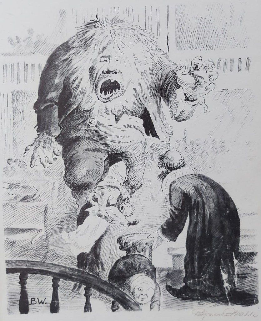 Bjarne also produced his own unique artwork. The drawing below illustrates one of his troll characters barging into the church and interrupting a christening ceremony.