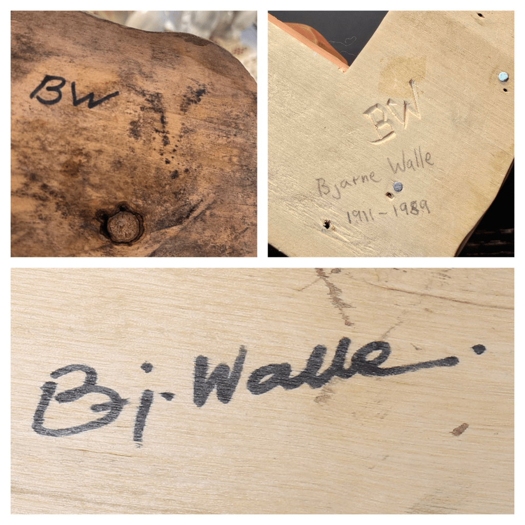 Bjarne Walle most commonly signed his carvings “BW” with a black marker or carved “BW” into the wooden base. There are also instances where he signed “Bj. Walle” and sometimes include the year the carving was made.