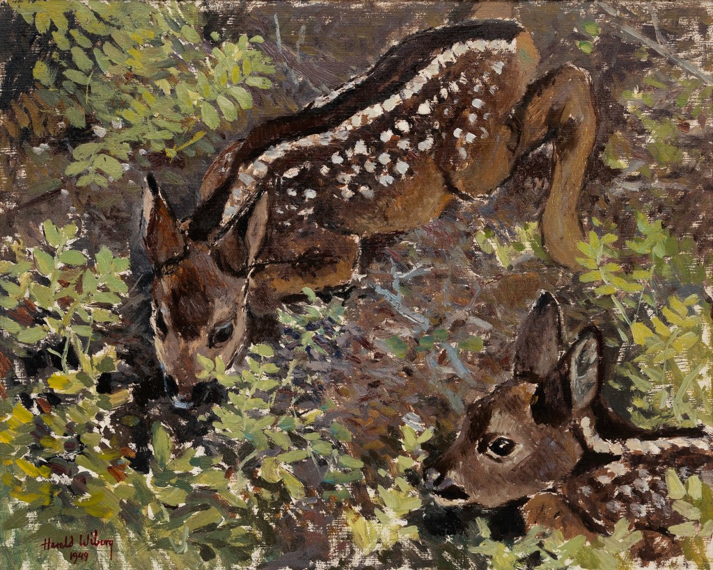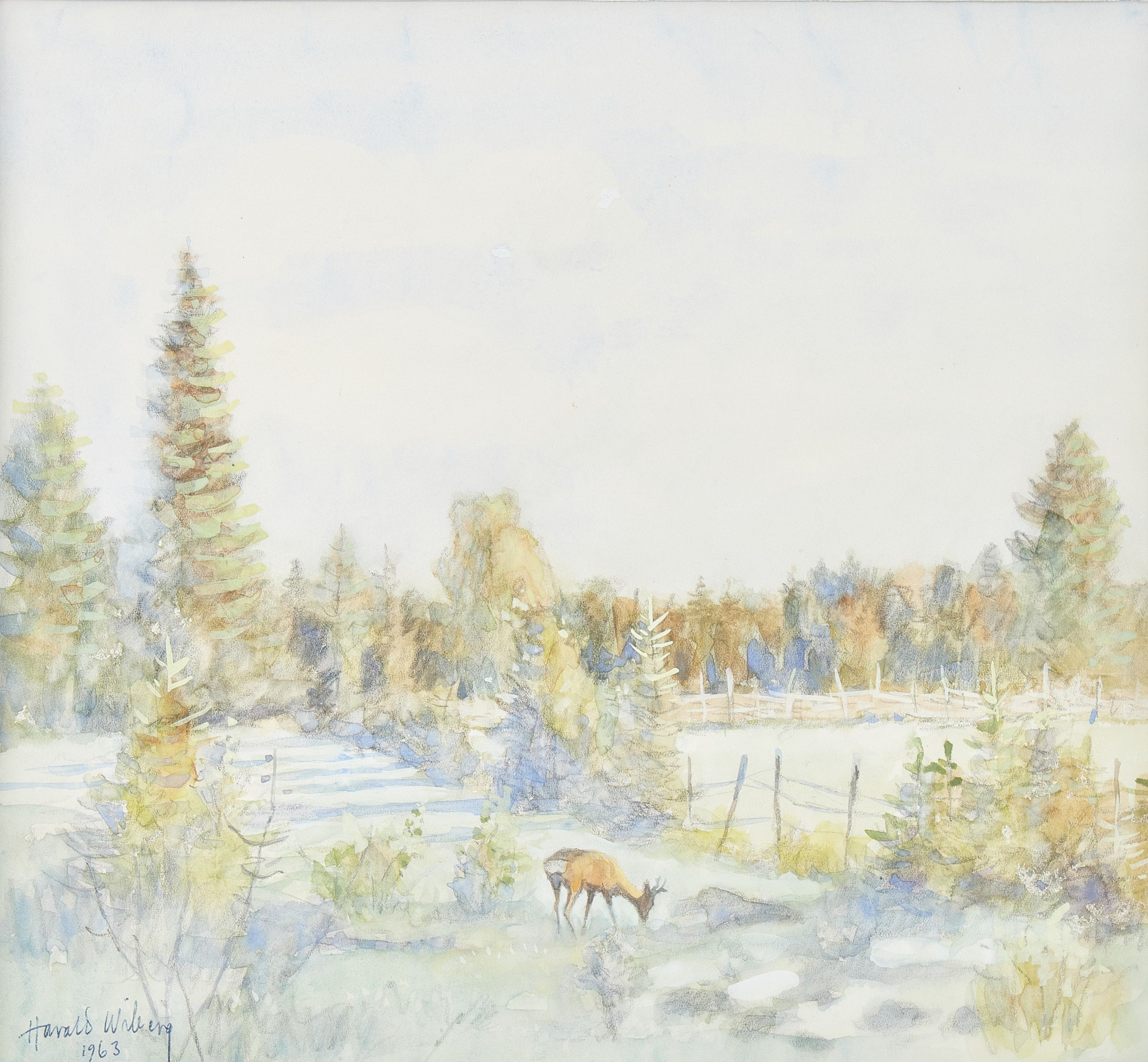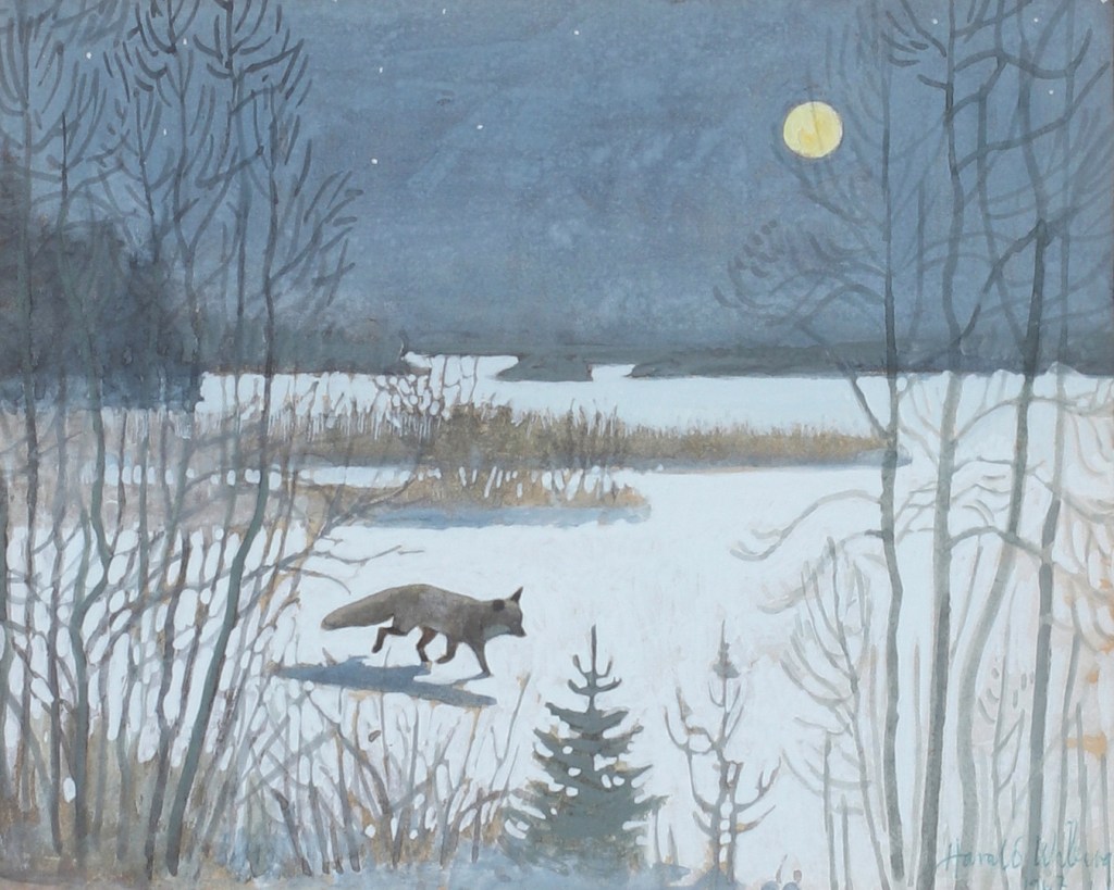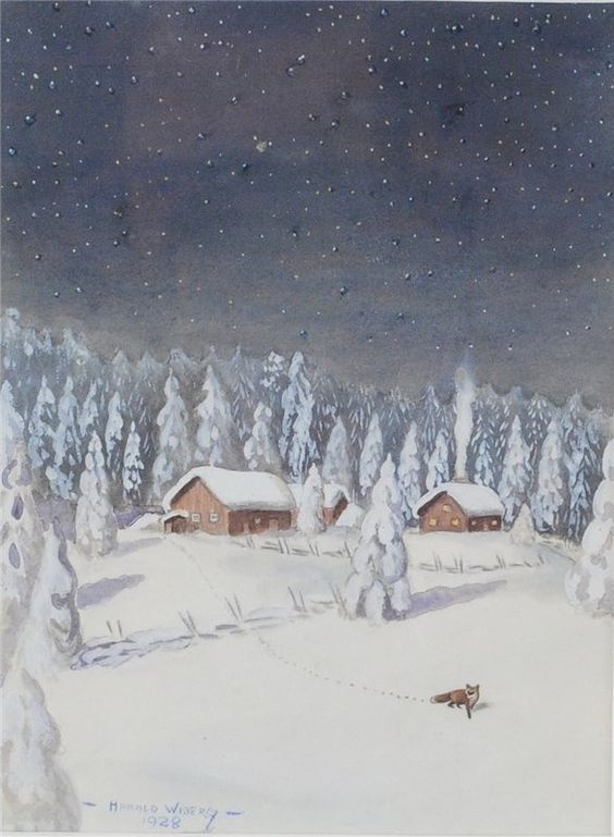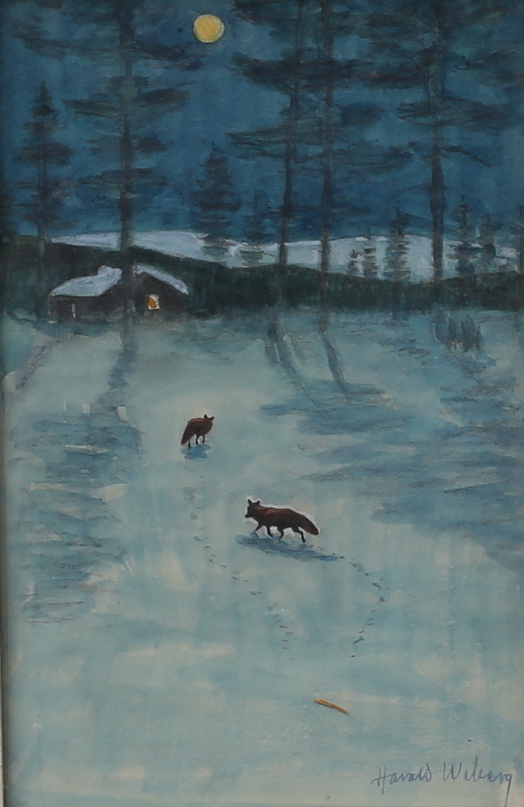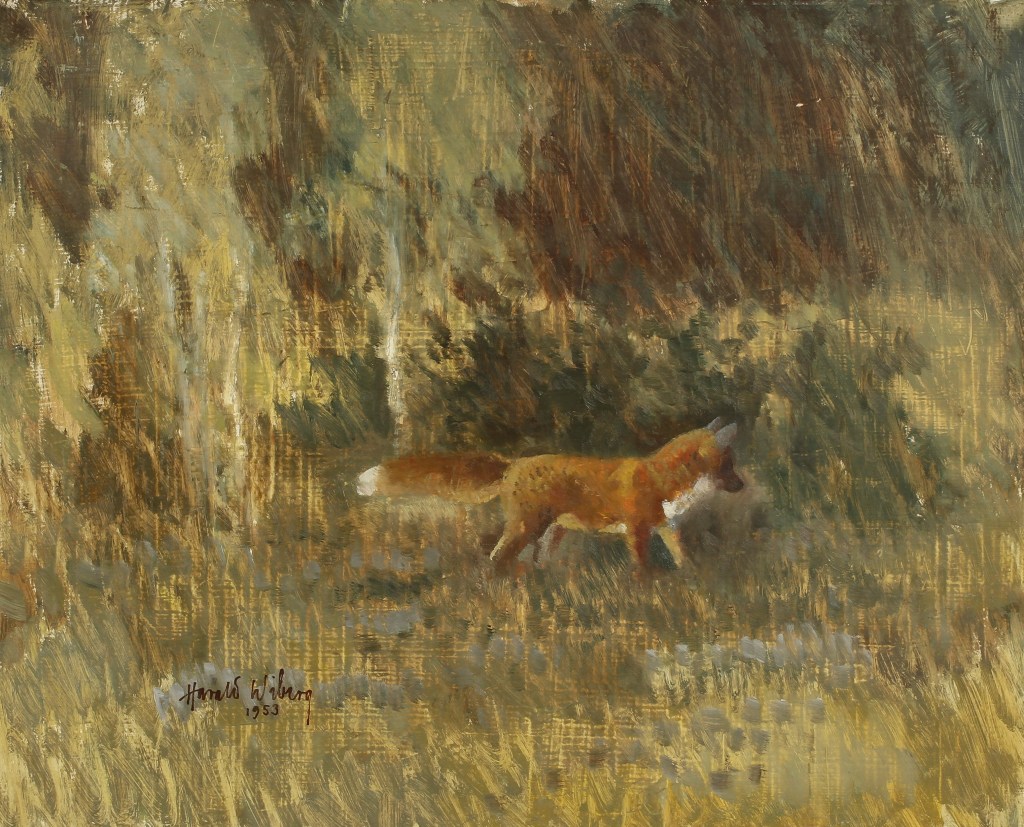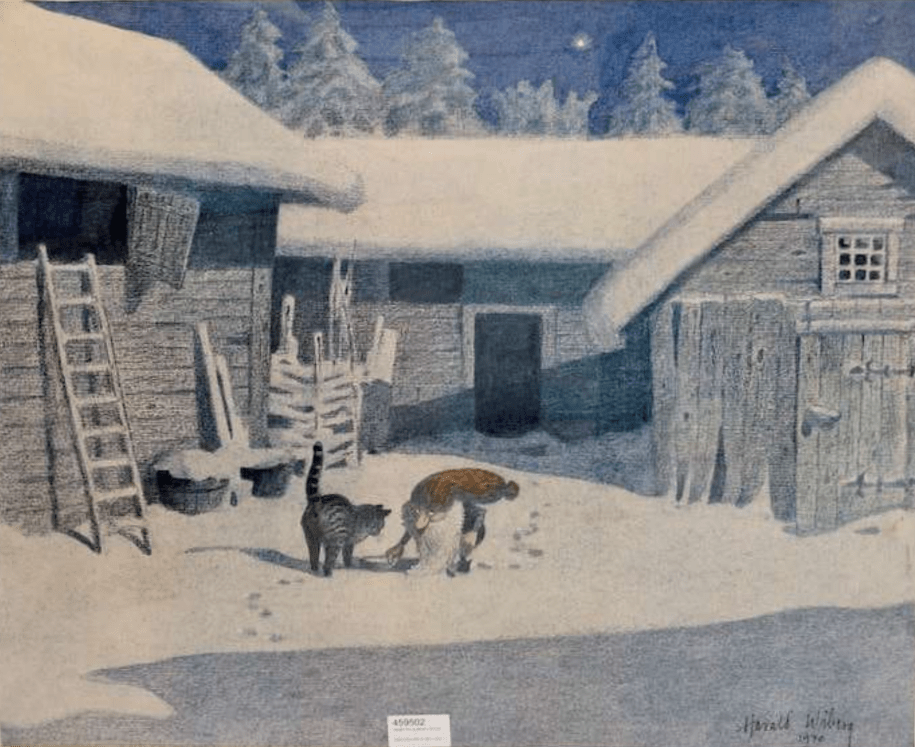 “In the tradition of Bruno Liljefors, Harald Wiberg depicted animals and Swedish nature in primarily sensitive watercolors, with a clear eye for the animals’ behavior in their changing environments and during different seasons. Among other things, he published the lithographic portfolio “Djur i naturen” (Animals in nature) in 1948, with a foreword by Björn von Rosen. He also illustrated twenty or so children’s books, most with animal motifs. Wiberg’s picture book illustrations for Viktor Rydberg’s “Tomten” and “Lille Viggs äventyr” (Little Vigg’s adventures) have also achieved international success” (Source: Swedish National Museum)