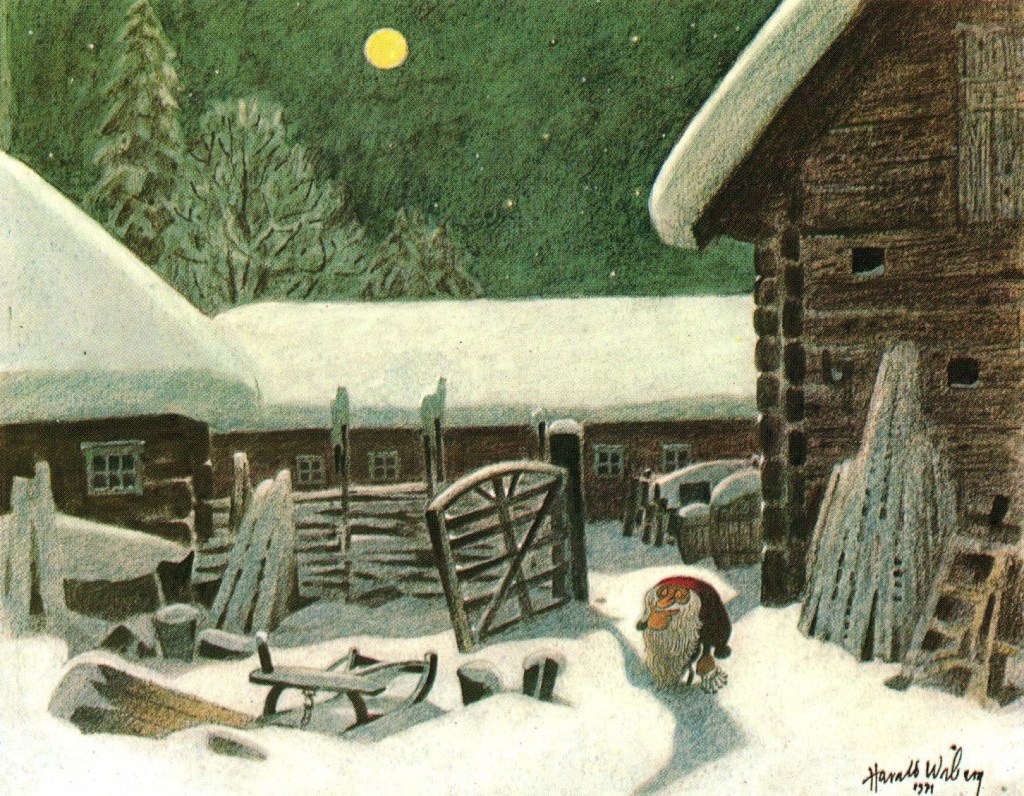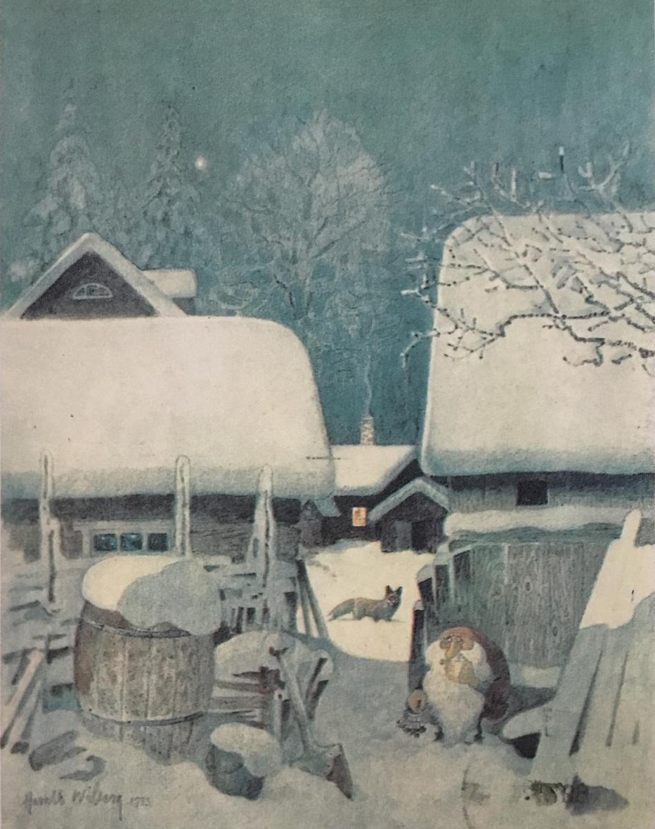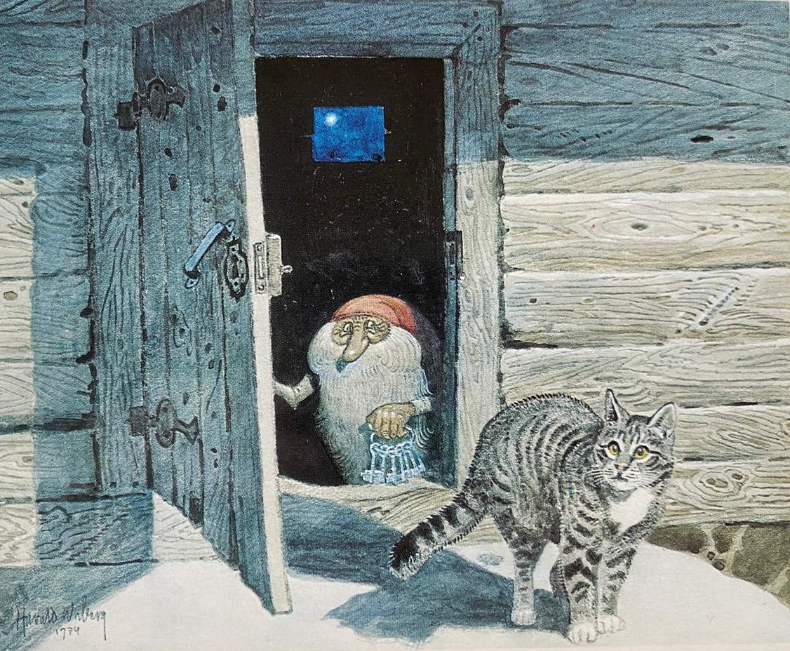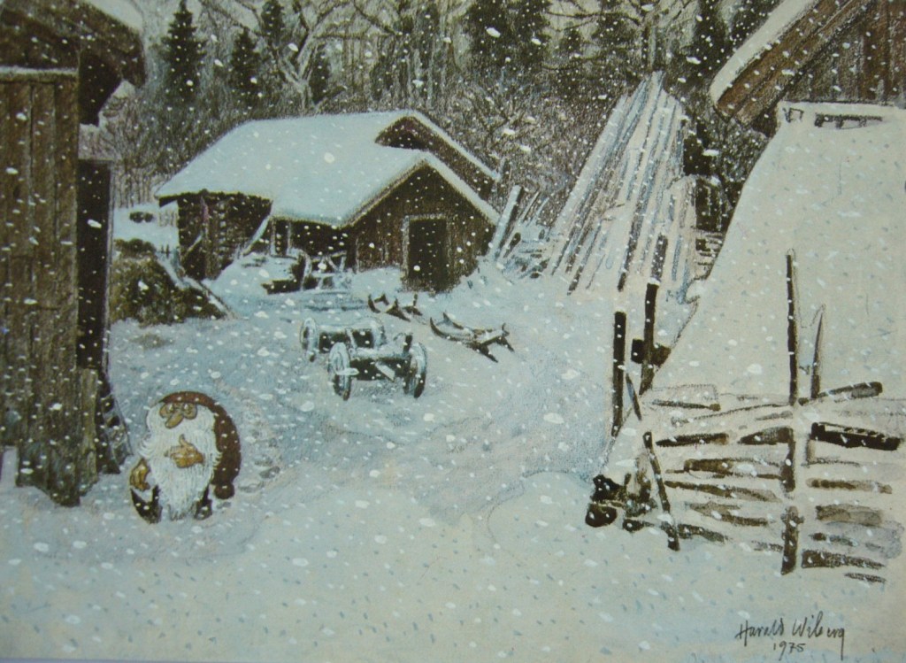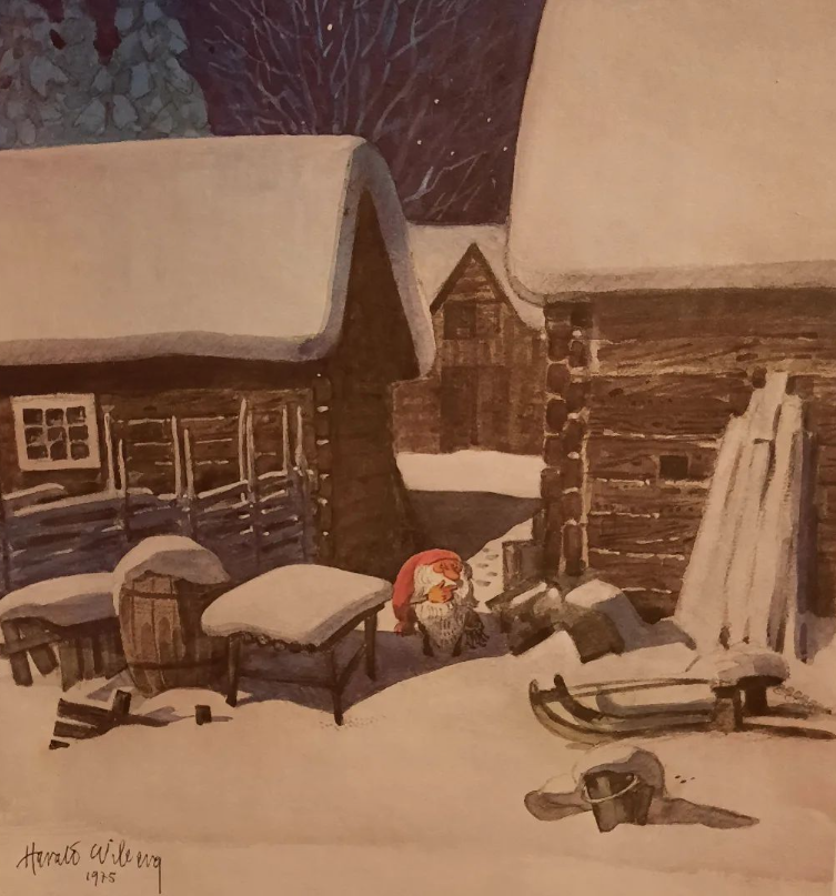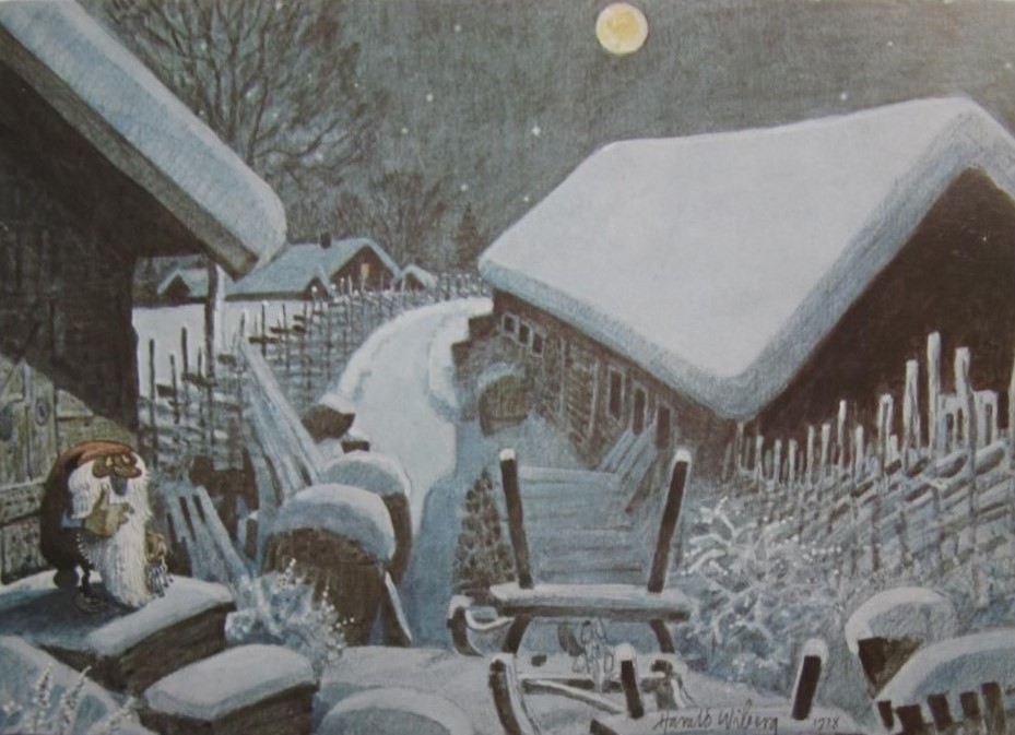 It was in Koltorpet that Wiberg, as a 4-year-old, saw a Tomten, which he then drew and painted for the rest of his life. According to his widow, Christina Wiberg: “Harald was open to most things. He was convinced that he had seen a Tomten when he was little. He believed in the Tomten and was not ashamed of it. But he pointed out many times that the lack of electricity was a prerequisite. One night he discovered a ghost in our house. But when he turned on the light, he saw that it was only the back of a chair. That disappointed him!” (Source: Mats Å Johansson, Hemmets Journal, 2007).