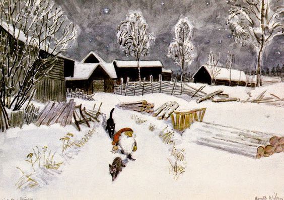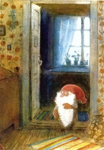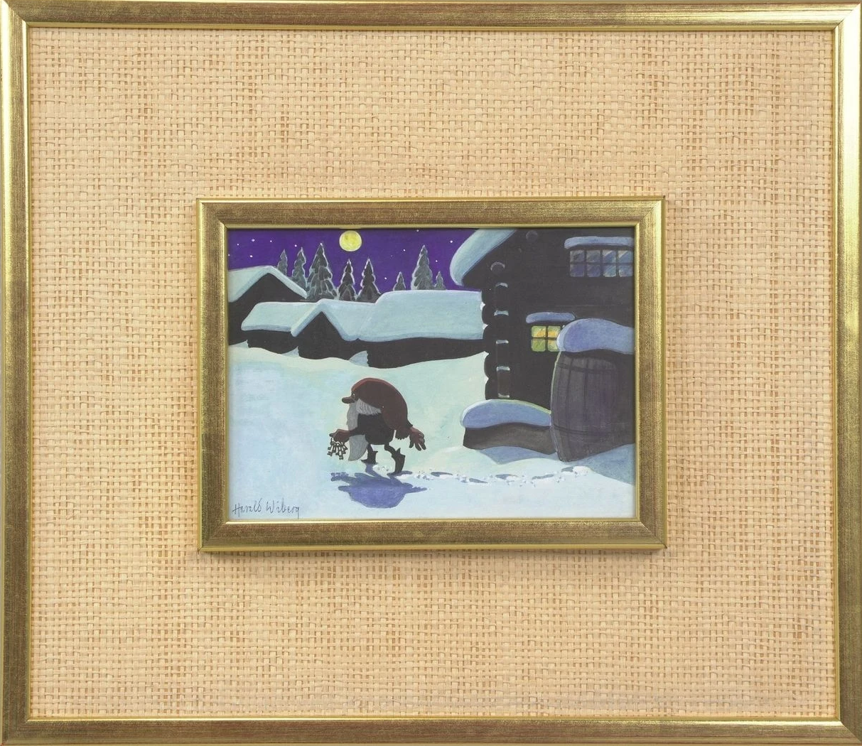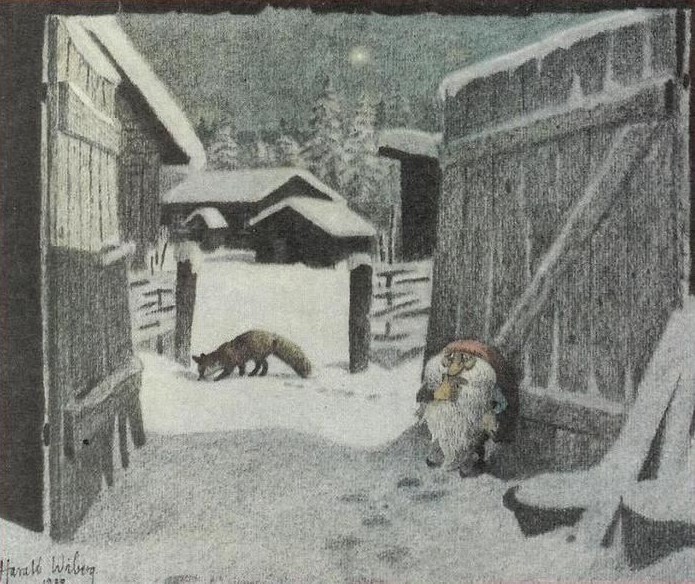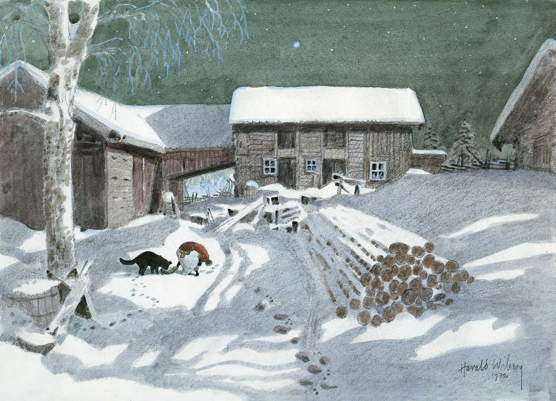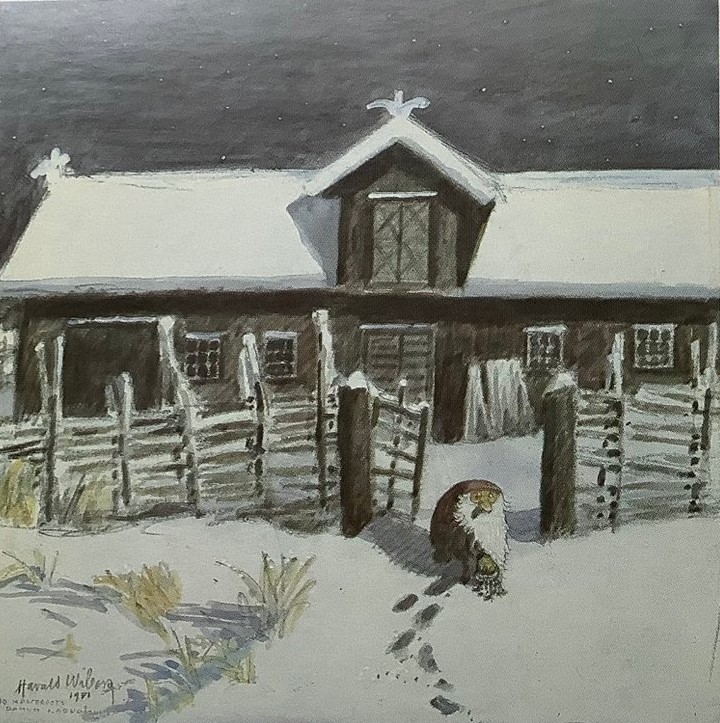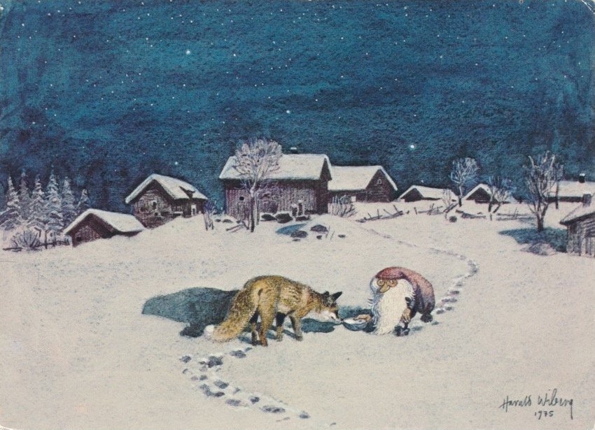 It was in Koltorpet that Wiberg, as a 4-year-old, saw a Tomten, which he then drew and painted for the rest of his life. According to his widow, Christina Wiberg: “Harald was open to most things. He was convinced that he had seen a Tomten when he was little. He believed in the Tomten and was not ashamed of it. But he pointed out many times that the lack of electricity was a prerequisite. One night he discovered a ghost in our house. But when he turned on the light, he saw that it was only the back of a chair. That disappointed him!” (Source: Mats Å Johansson, Hemmets Journal, 2007).