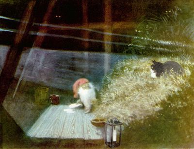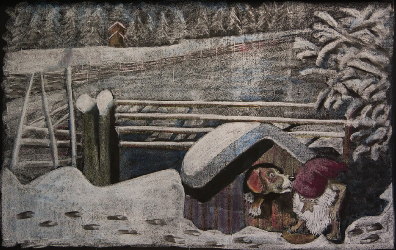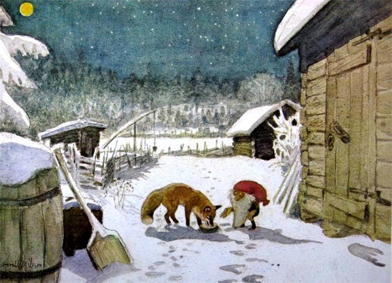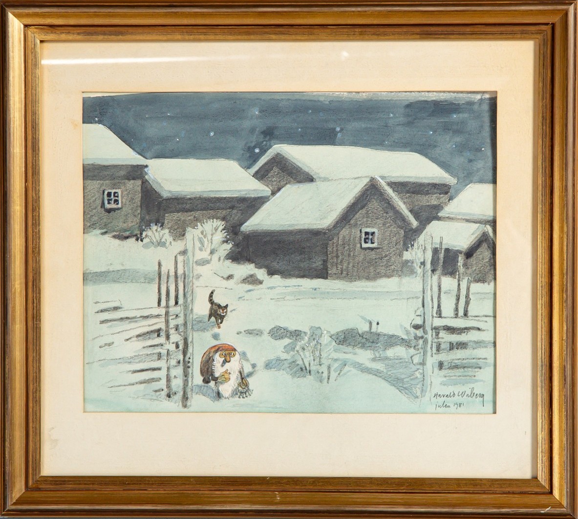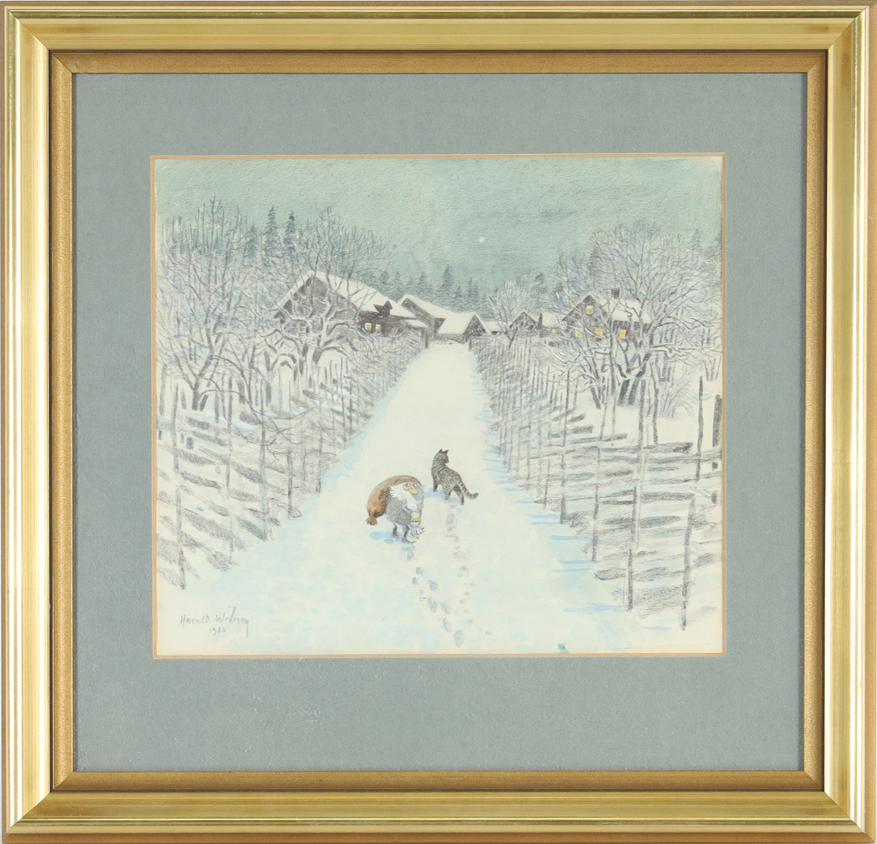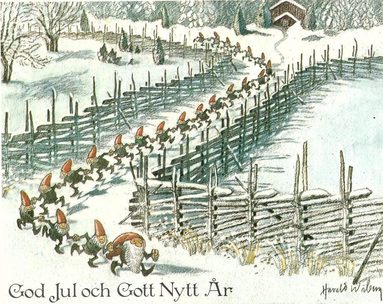 It was in Koltorpet that Wiberg, as a 4-year-old, saw a Tomten, which he then drew and painted for the rest of his life. According to his widow, Christina Wiberg: “Harald was open to most things. He was convinced that he had seen a Tomten when he was little. He believed in the Tomten and was not ashamed of it. But he pointed out many times that the lack of electricity was a prerequisite. One night he discovered a ghost in our house. But when he turned on the light, he saw that it was only the back of a chair. That disappointed him!” (Source: Mats Å Johansson, Hemmets Journal, 2007).