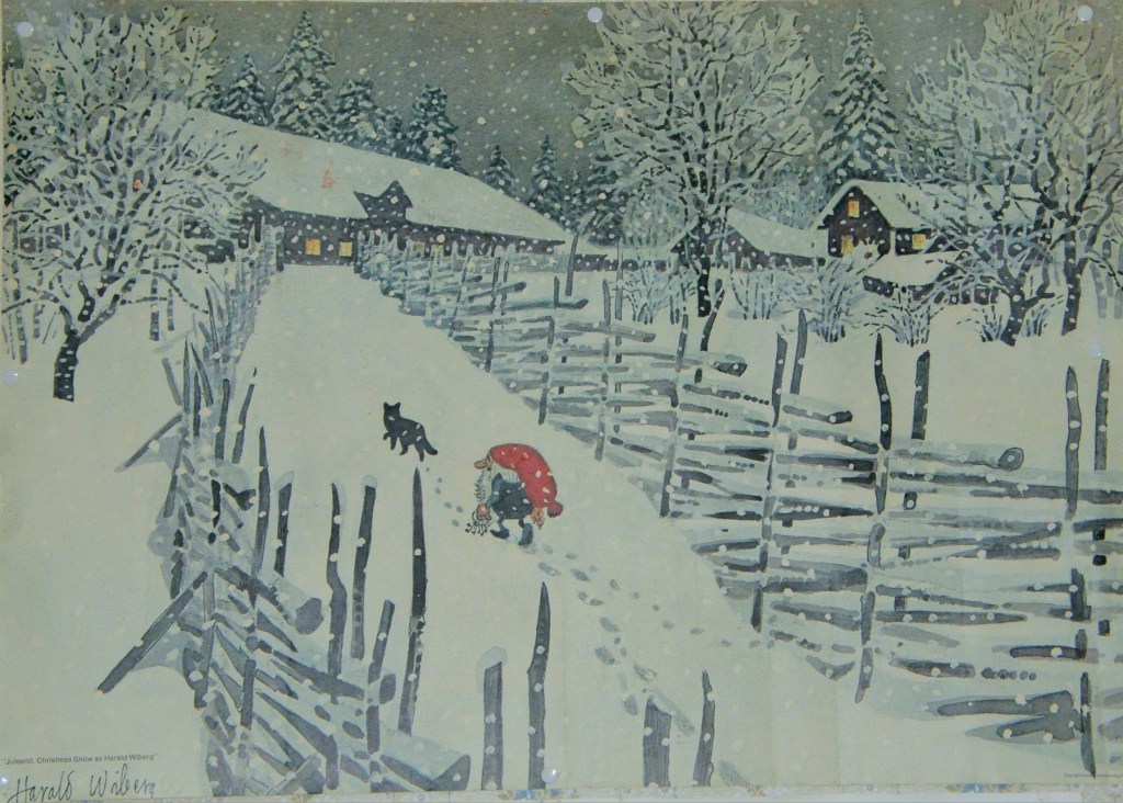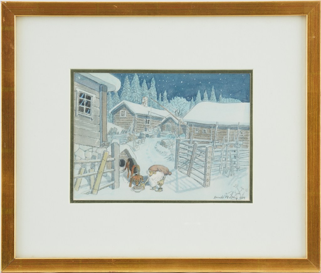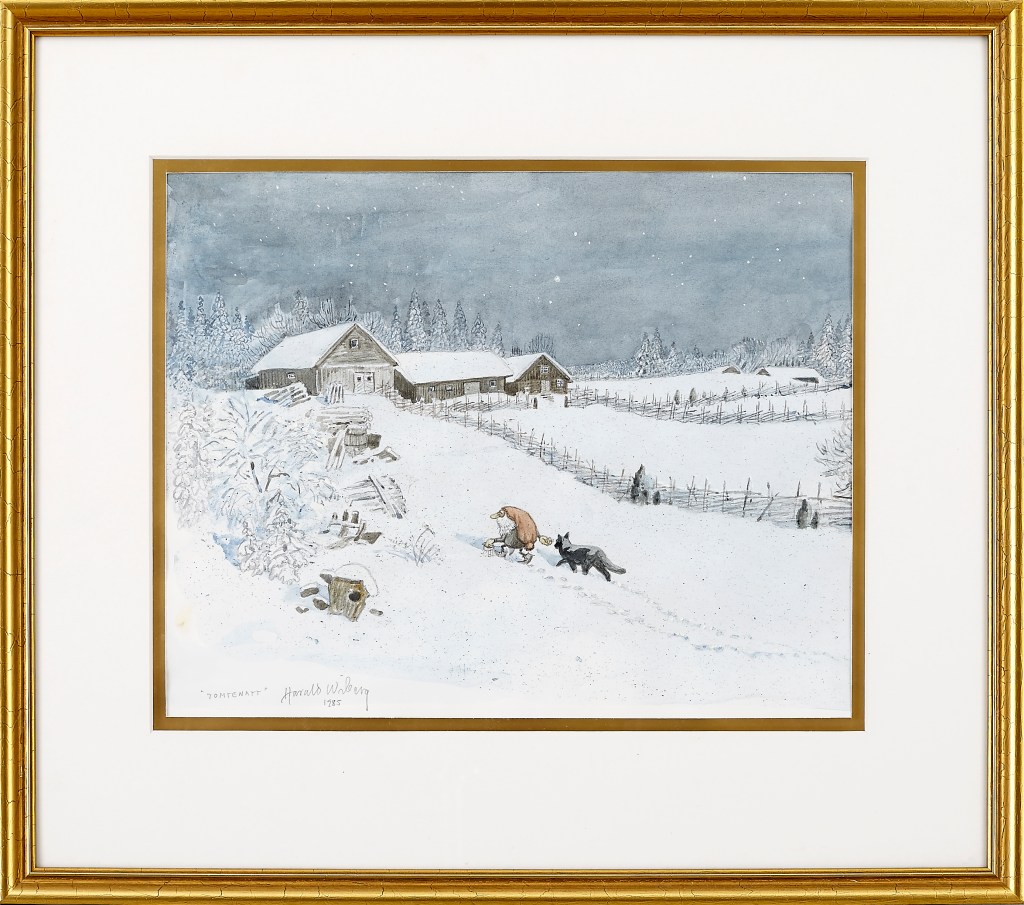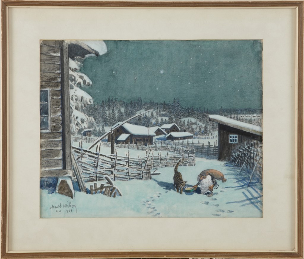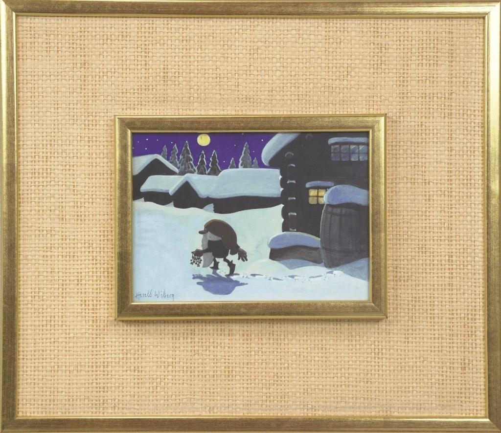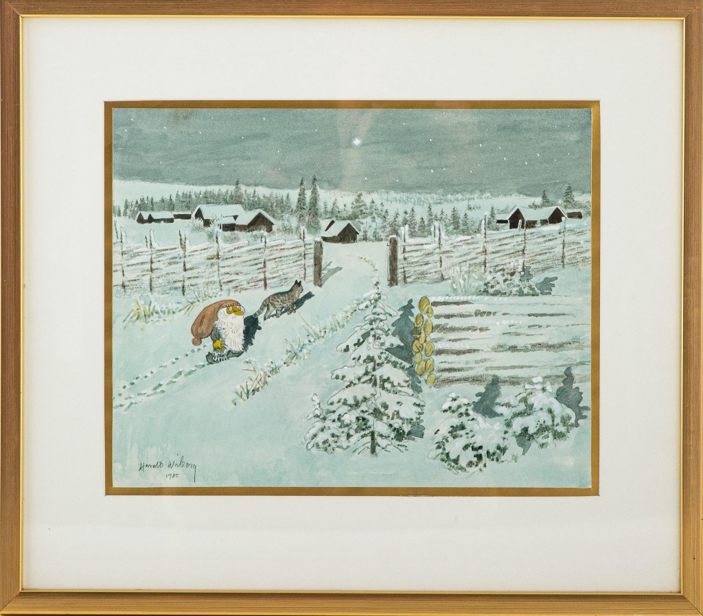 His original Tomten watercolours don’t come up for sale often, but when they do they are highly sought after and usually fetch a high price. As his primary art focus was nature and wildlife, it is uncertain how many Tomten watercolours Wiberg made. Most of them appear to be dated in the 1980s towards the end of his life.