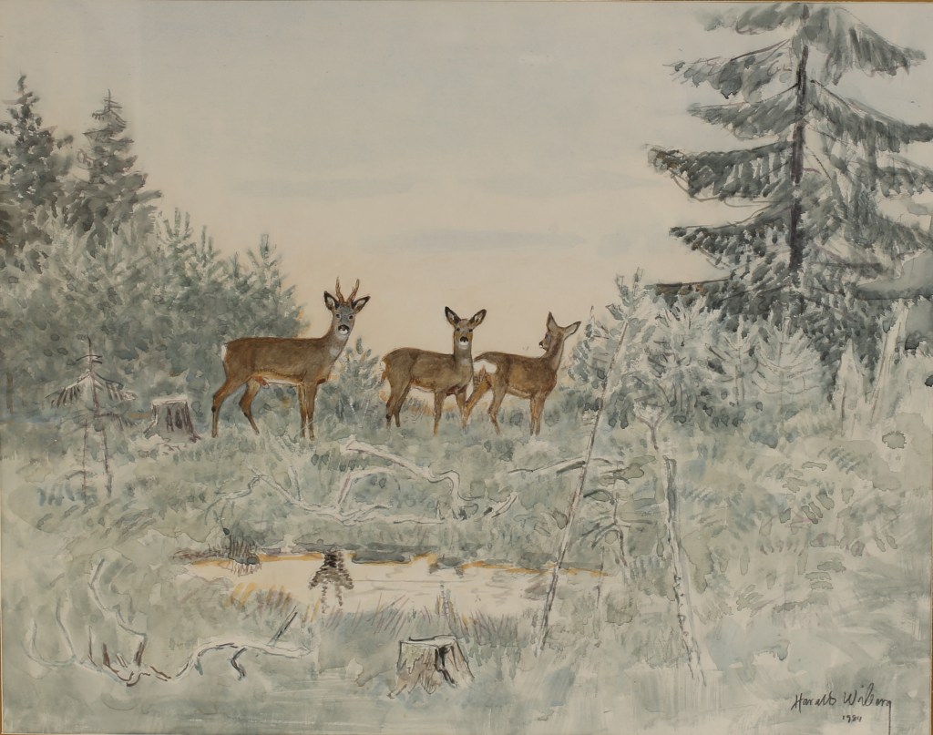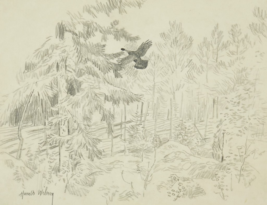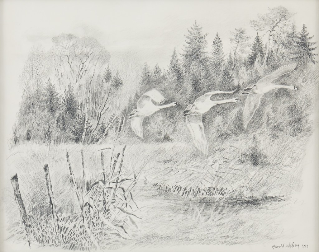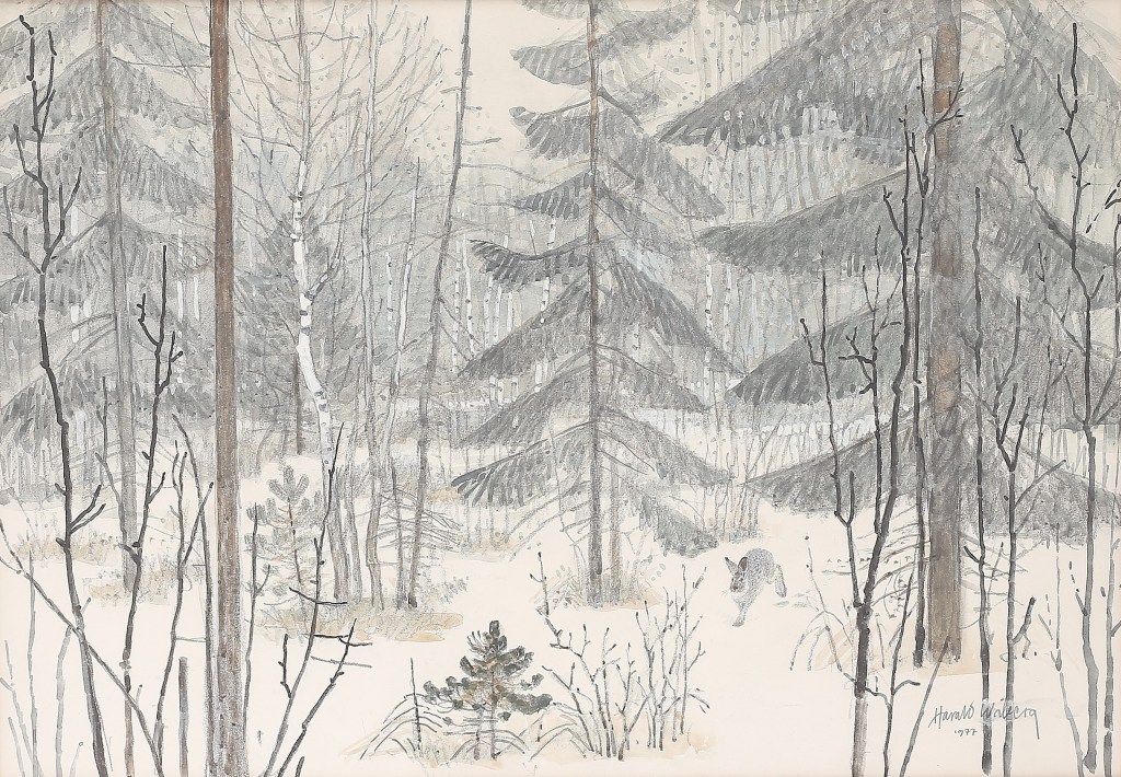 On 25 September 1986, a program by Boris Engström about the 78-year-old artist from Småland aired on Swedish TV1 with the title: Harald Wiberg: Hunter with pen and brush. In the program, Wiberg reflects on the beginning of spring. “Harald Wiberg is rarely seen without a pen or brush. He does not work to live – he lives to draw, paint, put down on paper everything that his sharp senses perceive from the wonders of nature“. You can watch a clip from the program below (unfortunately English subtitles are not available):