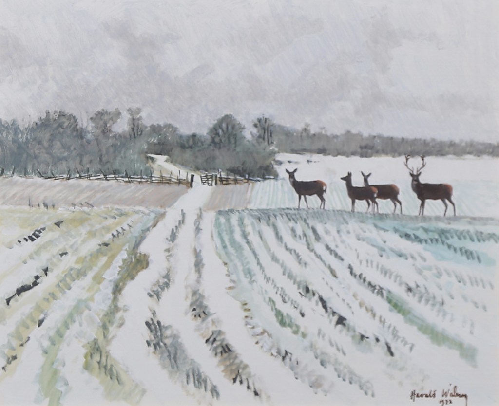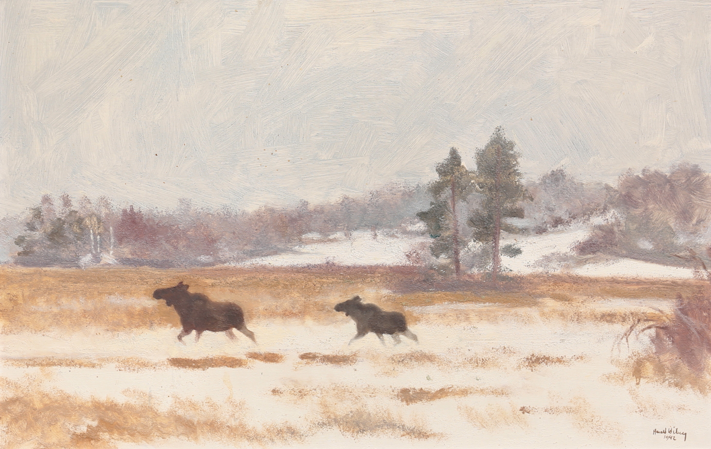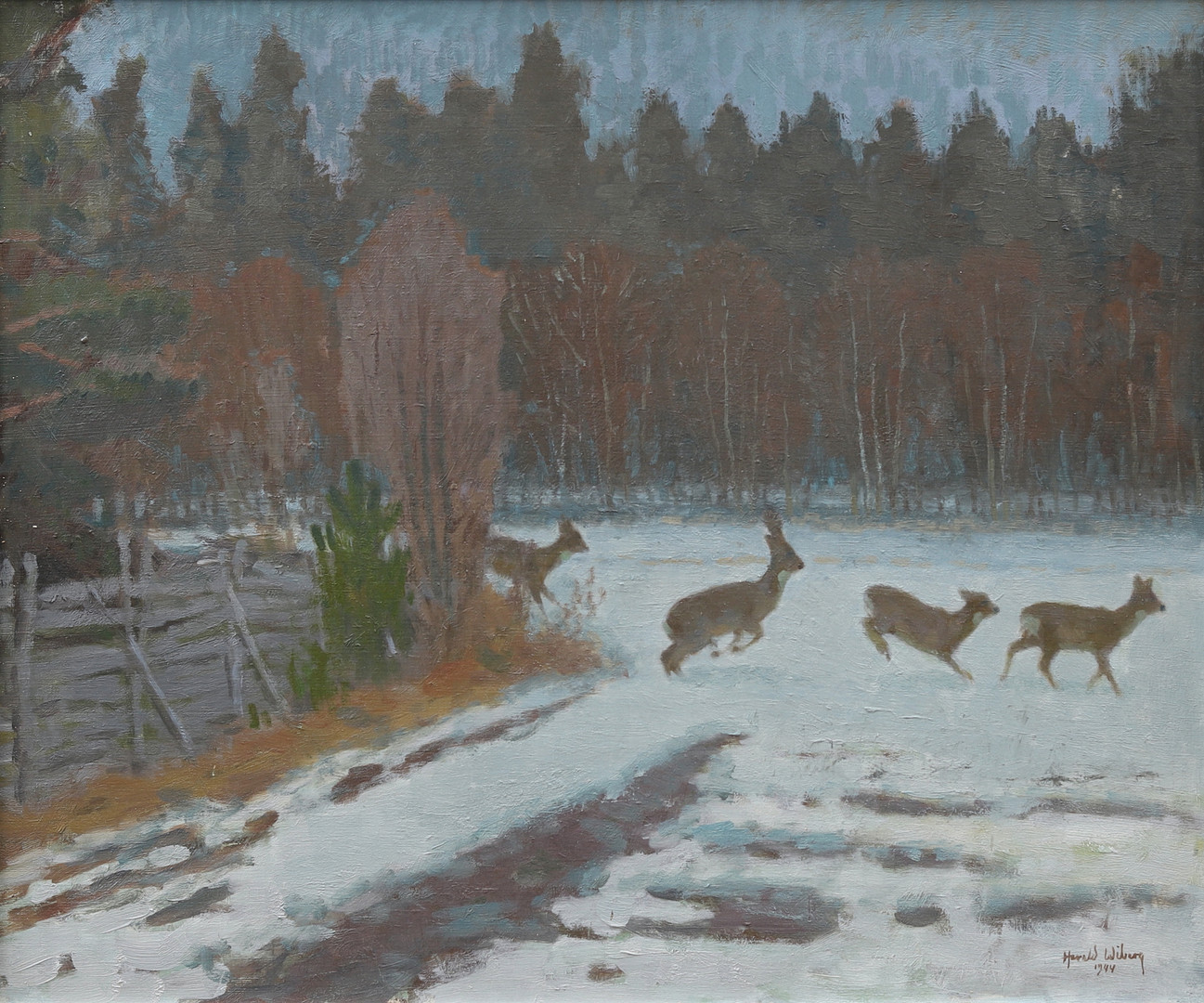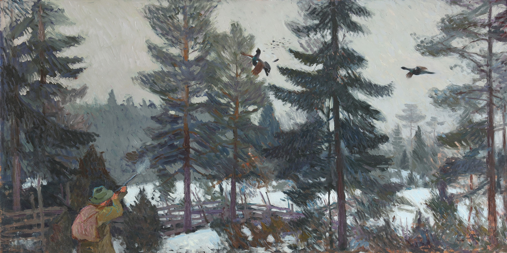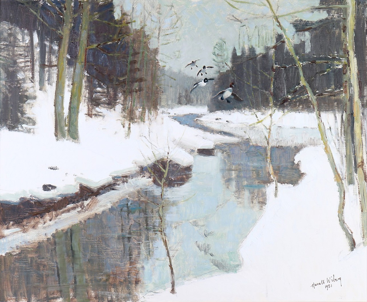 Harald also produced fantastic oil paintings which captured nature and wildlife in action with more depth. His oil paintings often feature serene winter scenes, capturing the quiet beauty and subtle color variations of snow-covered forests and fields. Wiberg’s technique is distinguished by his delicate brushwork and a keen sense of light and shadow, which lend a luminous quality to his paintings. His ability to convey the tranquility and isolation of nature through his use of soft, muted tones and intricate textures sets his work apart.