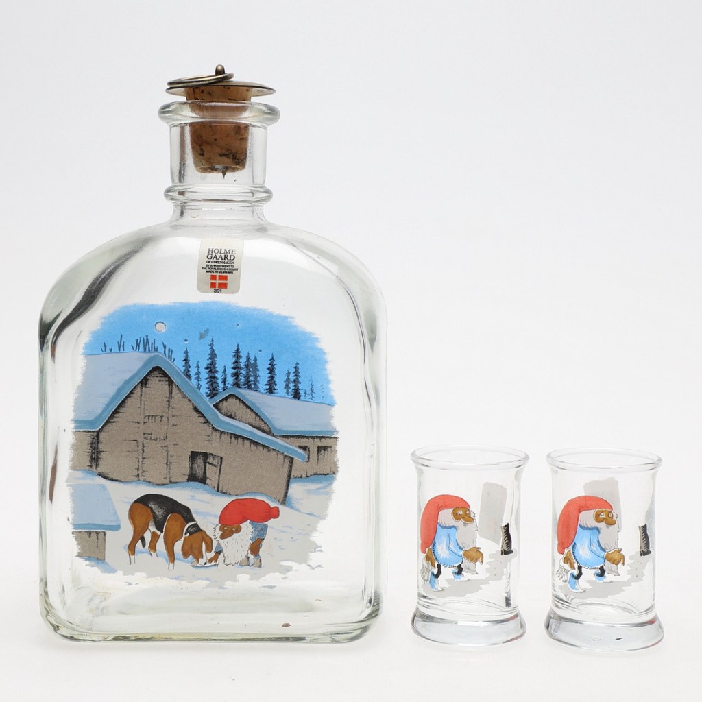 Harald Wiberg’s artistic reach also extended to glassware through a collaboration with Holmegaard, Denmark’s oldest and most renowned glass factory. Holmegaard’s tradition of combining innovative design with superior craftsmanship provided an ideal platform for Wiberg’s much loved Tomten character. His illustrations were translated into two different designs on carafes, each coming with two shot glasses. These items often featured scenes of the Tomten in winter landscapes, etched or painted onto the glass with meticulous detail.