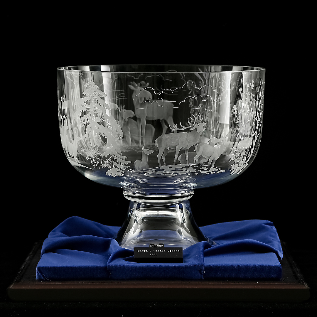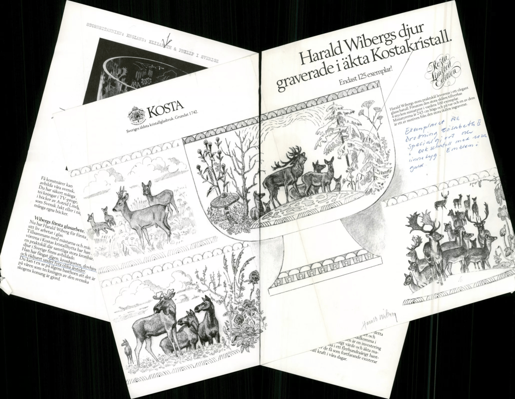 A special collaboration with Kosta Boda in 1980 resulted in the creation of limited edition, handmade full lead crystal glasses that featured Harald Wiberg’s wildlife designs.