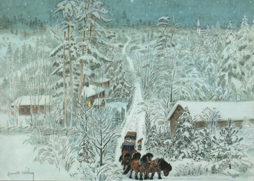 The success of these works prompted Wiberg to write and illustrate his own Tomten book entitled “Gammaldags jul”. The book was translated into English (Christmas at the Tomten’s Farm). Another work by Viktor Rydberg, Björn’s Advent on Christmas Eve (Lille Viggs äventyr på julafton, 1980) was also illustrated by Wiberg. The book was also translated into English (The Christmas Tomten).