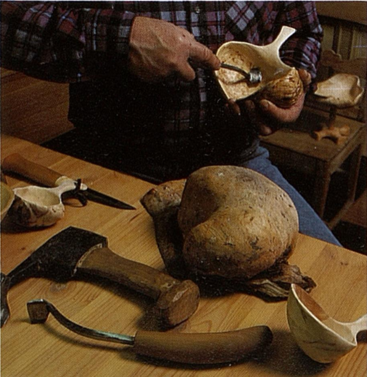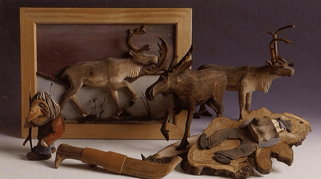 Woodcarving remained Ottar’s great hobby throughout life. In the pictures below we see him carving moose, reindeer, and trolls. He hollows out tree roots to create bowls, and makes knives with animal heads.