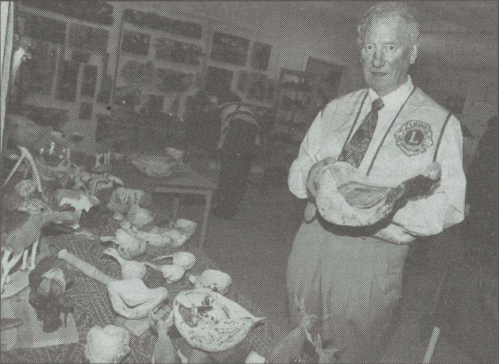Ottar Grubbli was a member of Årvoll Lions Club for many years. In the photo below, he is selling his own bowls, trolls, and other objects carved from wood at a club exhibition in 1998.